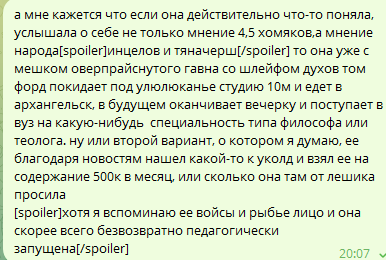 >>6350615 → >Но и выйти в никуда она уже не сможет, тут либо нужна мощная финансовая поддержка от родителей, что маловероятно Ну, ахуеть. Сейчас бы ещё родителям пахать на той самой обычной и нищей работке, которую она с братиком так презирает, чтобы карамора наконец-то соизволила себе жизнь не гробить своими же руками. Ее тут уж совсем какой-то несамостоятельной и тупой делают. Да, она пиздючка, но очевидно, что в размышления способна. Не раз выписывала базу про свой род деятельности, менталку и тд. Короче, все ей понятно. У неё были и есть все ресурсы, чтобы чему-то учиться и в хуй не дуть (буквально), но она лишь накидывала солей, травы, романтизации диагнозов, которые есть ли у неё вообще? И все это ради ебучей романтизации, чтобы быть эффи стонем из архангельска. Мне тоже ситуация кажется грустной после сообщения мамы, но и не стоит уменьшать само желание караморы жить на широкую ногу и не как все. Сорри нот сорри, но в 18-20 лет ты уже должен понимать, что да жизнь несправедлива. Родители могут недодать любви и денег (хотя они даже не бедствовали блять)), ради хорошей жизни нужно покрутиться (в том же обучении) и тд, а она этого не хочет. Так что тут только надежда на взросление и развитие лобной доли, если она мозг полностью не погубит.