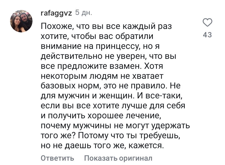 >>6352373 Вот хз как у них там в Испании с этим >>6352368 У них там самый частый аргумент фигурирует "я могу все сама", "Я не ребенок беспомощный", "у нас мужики не считают нормой домашнее насилие"( вот с этим хз как кстати, у них там реально его мало?) "Вы проститутки если хотите оплату счета(мужик пишет), "мне неприятно когда меня покупают"