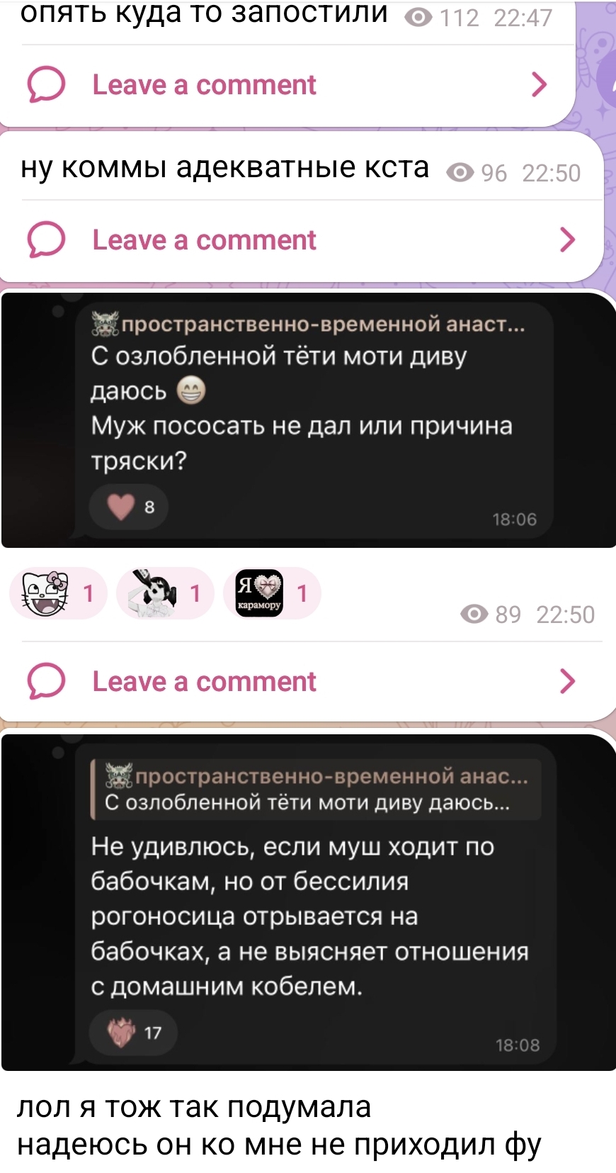 Плюсую. Терпеть не могу общественный транспорт из-за этого. При мне как-то две бухие кобылы доебались до беременной девушки, чтоб она им уступила. Все остальные пассажиры их сразу же осадили, но опять же характерно, что эти бабы не до мужчин так доебались, а именно до девушки. Ещё в ковидные времена ехала в маршрутке и там всю дорогу какой-то боров без маски кашлял и чихал, у всех ноль внимания. Молодая девушка в маске чихнула и бабка сразу налетела на неё РЯЯЯЯ ЧТО ТЫ БОЛЬНАЯ ЕЗДИШЬ ДОМА СИДИ ЗАРАЖАЕТ ОНА ТУТ ВСЕХ. На борова-то боялась так залупаться.