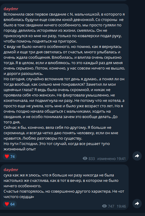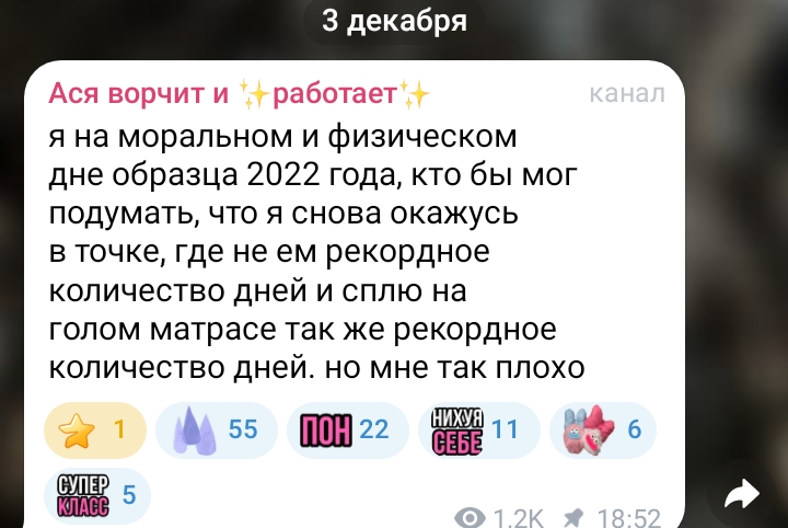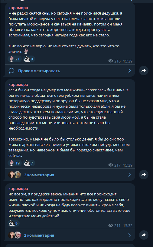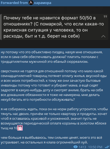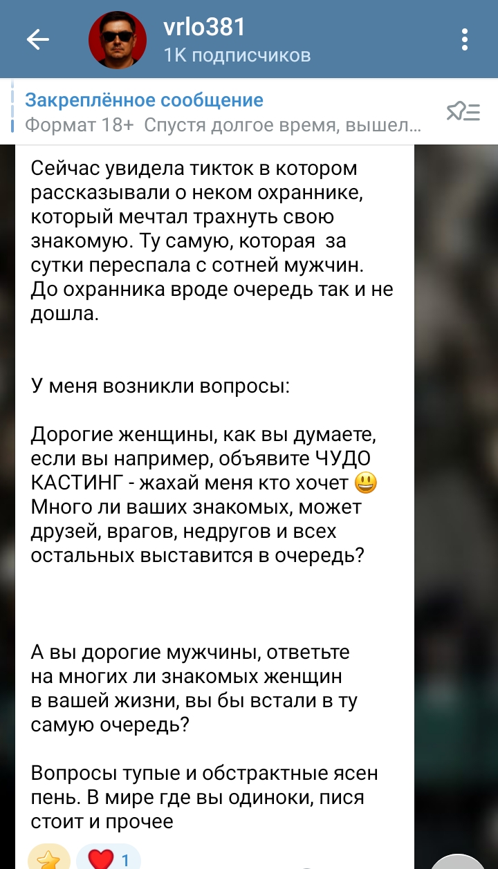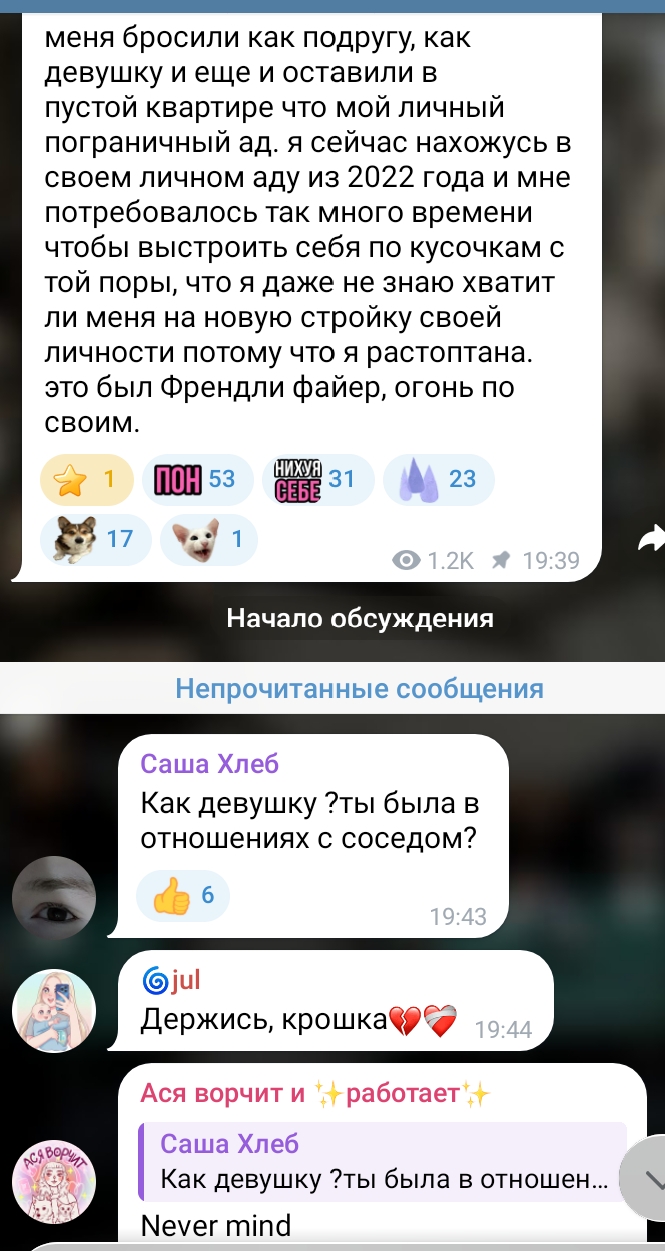 Вы все за ту курьершу заступаетесь? За эту тупую пизду, которая пришла в нарко-проституцкий тг и начала мораль читать? ИМХО такие люди будут везде обосраны, хоть в нарко-притоне, хоть на солевой вписке, хоть в маке если начнет про пп затирать. Такие все умные, тыкаете в проститутку лол. Лучше бы бугуртили так на сериал Жизнь по вызову с прилучным, где в пропаганда тоже есть
