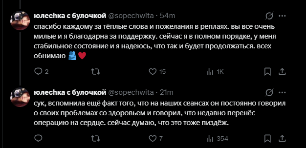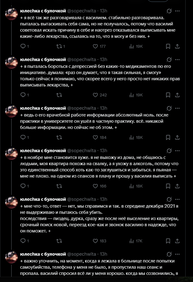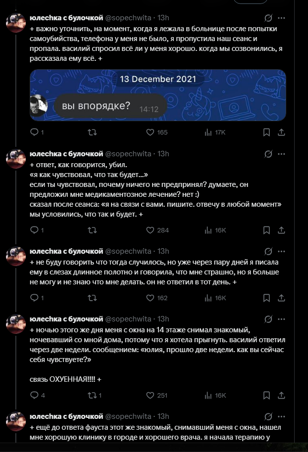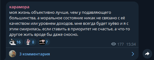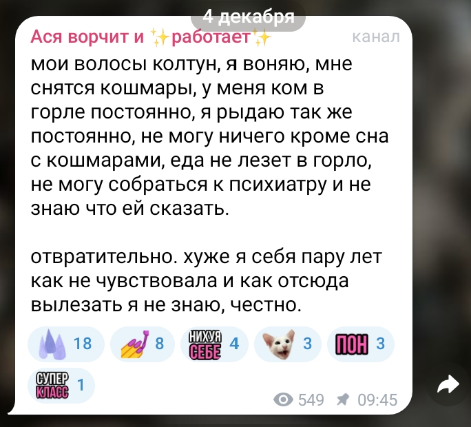 Карамориха: не знаю от чего мне плохо, но очень плохо Также Карамориха: работает баком для слива Боится, что психиатр скажет, что надо бросать сферу и устраиваться на норма работу
