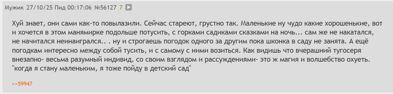 >>6457048 К слову о корреляции тупости и возраста, этот высравшийся уо пездюк поймет, какой бред высрал, только когда сам вырастет, будет батрачить и пиздюка растить на свои кровные и впервые поймет, что такое разные условия, нехватка времени и ответственность