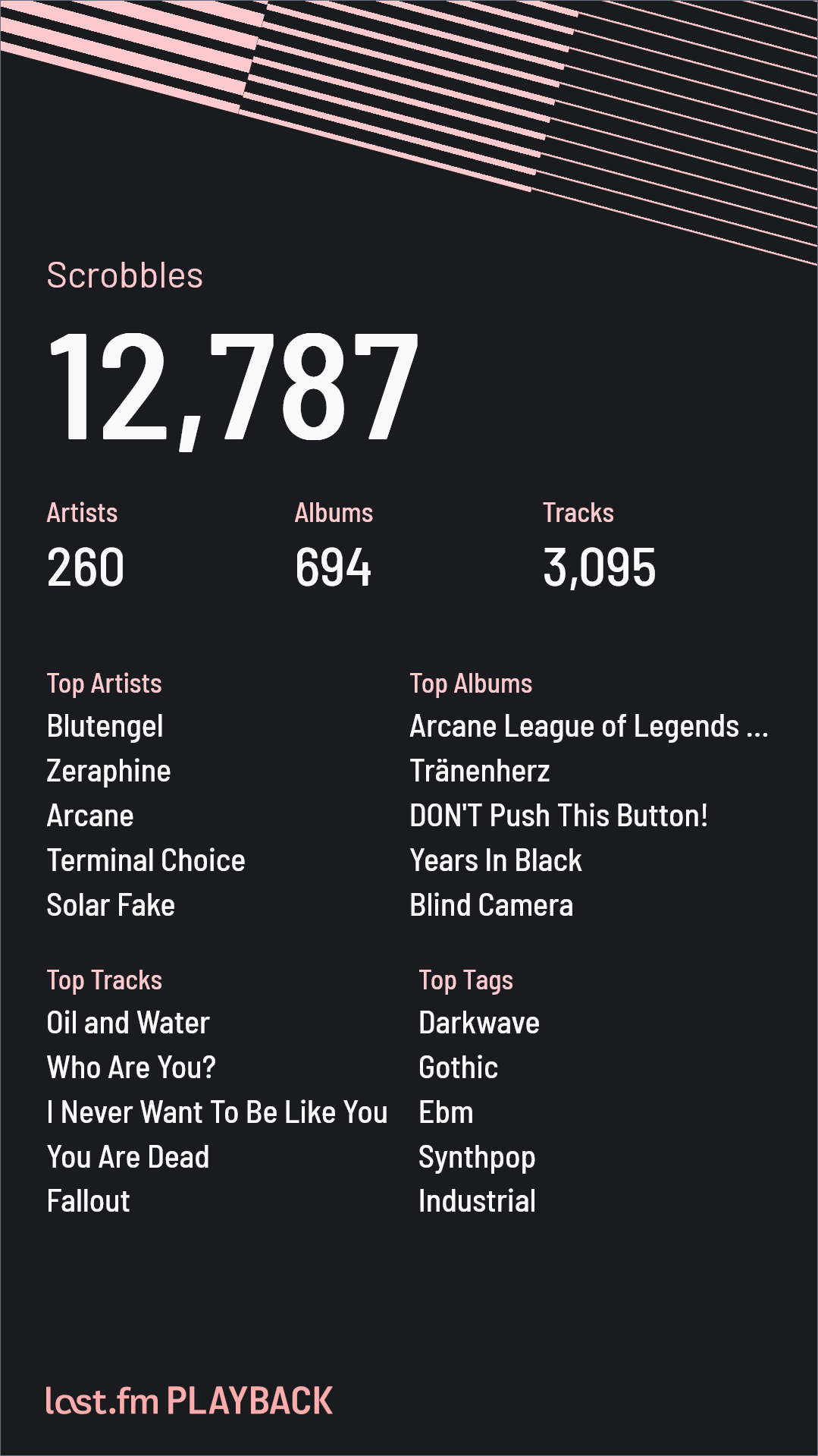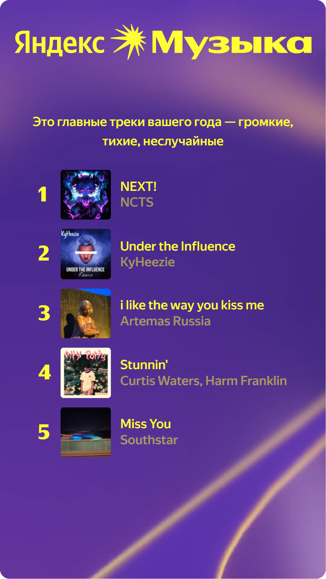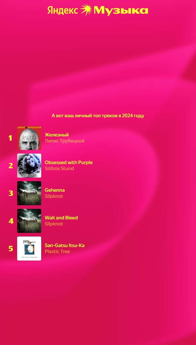Ну такое, в этом году чёт неинтересно. Топ треки в топе просто потому, что это первые треки моих плейлистов, которые я просто врубаю с начала, поэтому они, естественно, играют чаще всего.