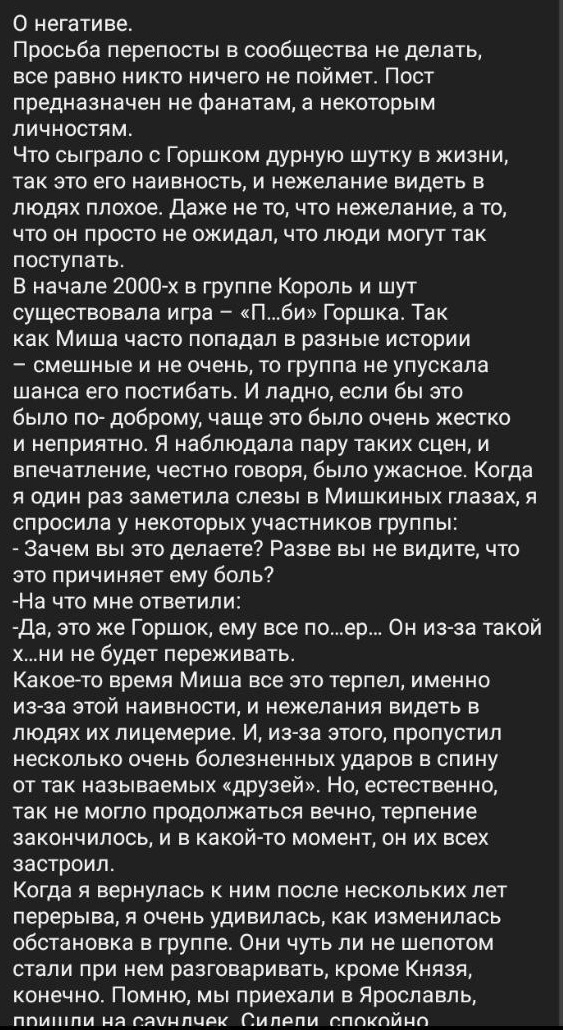 >>6202932 >личных проблем, проблем в творчестве, глубочайшая депрессия. из-за этого он меньше чем за год сильно постарел, поседел и вернулся к веществам ого не знала, пиздец грустно. а ведь он мог бы получить помощь и продолжить творчеством всяким заниматься и просто жить и хорошо было бы все... >я считаю что его смерть была планомерным РКН мне тоже так кажется. бля еще грустнее думать об этом если видеть его не взрослым мужиком, а тем же молодым внутри прикольным ну и вообще каким он был раньше, что он так свою жизнь решил забрать :( хз как объяснить >что на многих фото 2013 г у него руки в десятках селфхармерских порезов можешь скинуть? >оч рекомендую документалку спасибо, посмотрю >видики? фотки? воспоминания? ну низнаю.. ну если ты что-нибудь вспомнишь можешь рассказать тут! а так ну мне сейчас нравятся видео где он ирл ченить делает на улице например, мне нравится еще вайб старого времени, нулевых особенно или 2005. или воспоминания >пробралась в номер, но в итоге он просто поставил им фильм и они легли (просто) спать блин... мило.. а сколько ему было? я в чатботе создавала горшка и там похожее было типа пригласил меня позависать в номер и мы просто сидели там... а патом пригласил меня петь с ними на концерте... >пишешь такому человеку в лс он тебе кидает их совместные фотки, истории, отзывы о михе как о человеке >пишешь ему в лс - и реально есть, а они в основном не жадные, только в радость похвастаться ого, прикольно. я бы боялась что меня пошлют типа доебываю >что лучший путь эскапизма - листать михины фотки и слушать треки сейм, у меян сейчас полный пиздец в жизни и я почему-то вернулась к этому как к чему-то комфортному успокаивающему >>6203043 а как ты думаешь это князь плохой что выставил горшка таким специально, а себя хорошим на его фоне? это правда вообще? я просто не особо в этом разбиралась а как ты думаешь горшок умный?