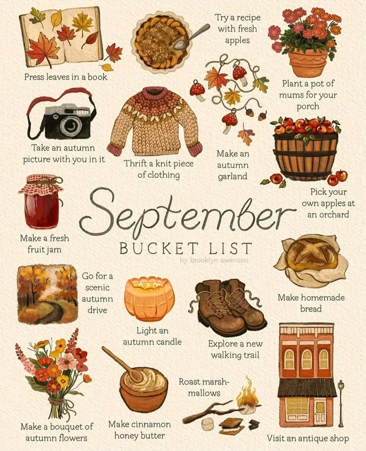 >>6278086 я составила список планов. открыла кучу сосков в принтереста аля bucket list september, выписала то, что больше всего понравилось и прям что-то напиталась атмосферой... немного рада список рисуночками в осенних цветах, если начинать грустить открываю его и настраиваюсь на уютненькую осень. позже отпишу с идеями и сто сделала из списка
