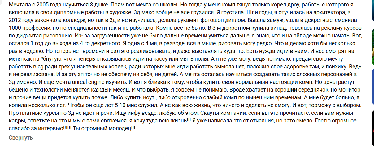 Повезло тем, у кого мечты совпадают с рынком труда. Как можно мечтать создавать 3д модели на компуктере? Дрочить программы эти душные. Ладно ирл из глины или чего делать. Может она думает это лепка, но даже zbrush душная.