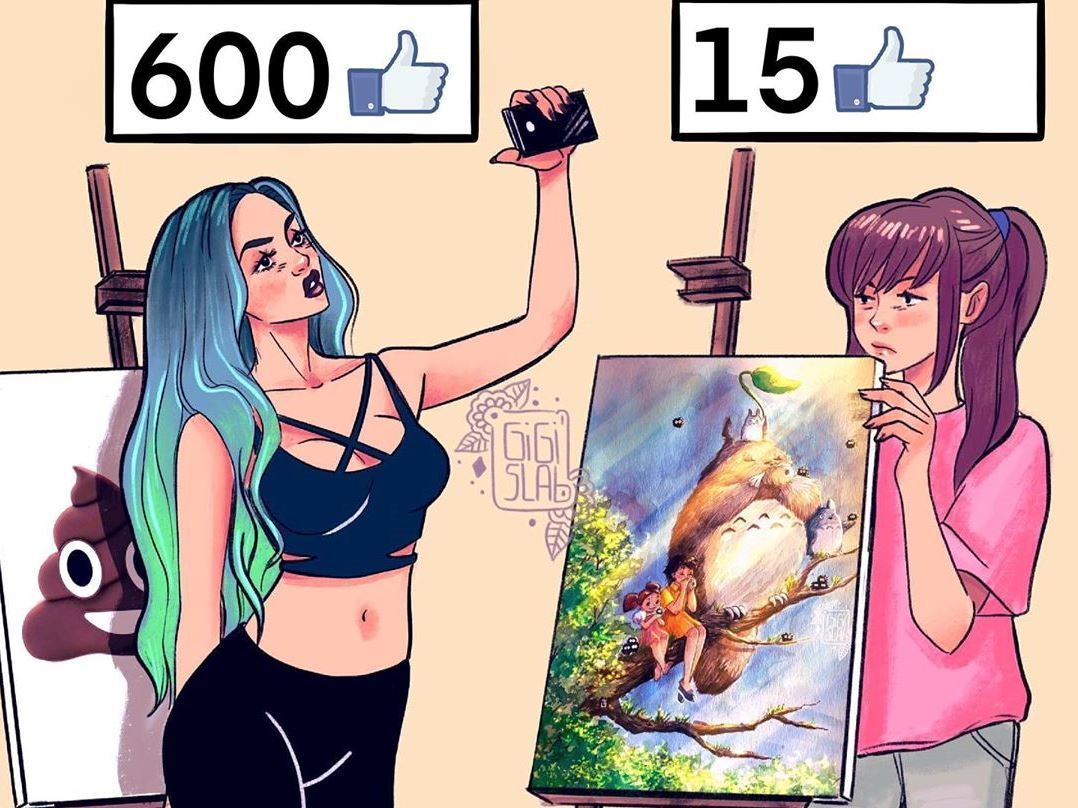 Я завидую людям, которые просто рисуют и счастливы, и им не важно сколько у них лайков, они не меряют свою самоценность тем, насколько круто у них получается.
