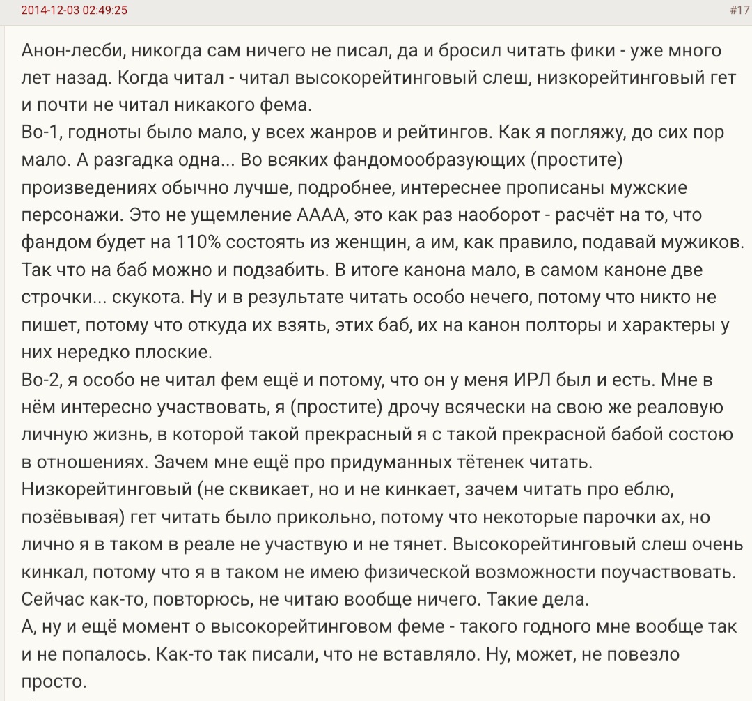 >>6351989 На холиварофоруме есть еще раздел "маленький грязный фанфикшн секрет." Там обсуждают плохую, негодную фанфикоту, но которая при этом настолько дрочибельная и попадает в кинки, что запоминается лучше, чем любая другая. Там один слэш, учитывая контингент... вот хотелось бы у сис в GL поинтересоваться, есть у вас на примете такие фемслэшные фички?