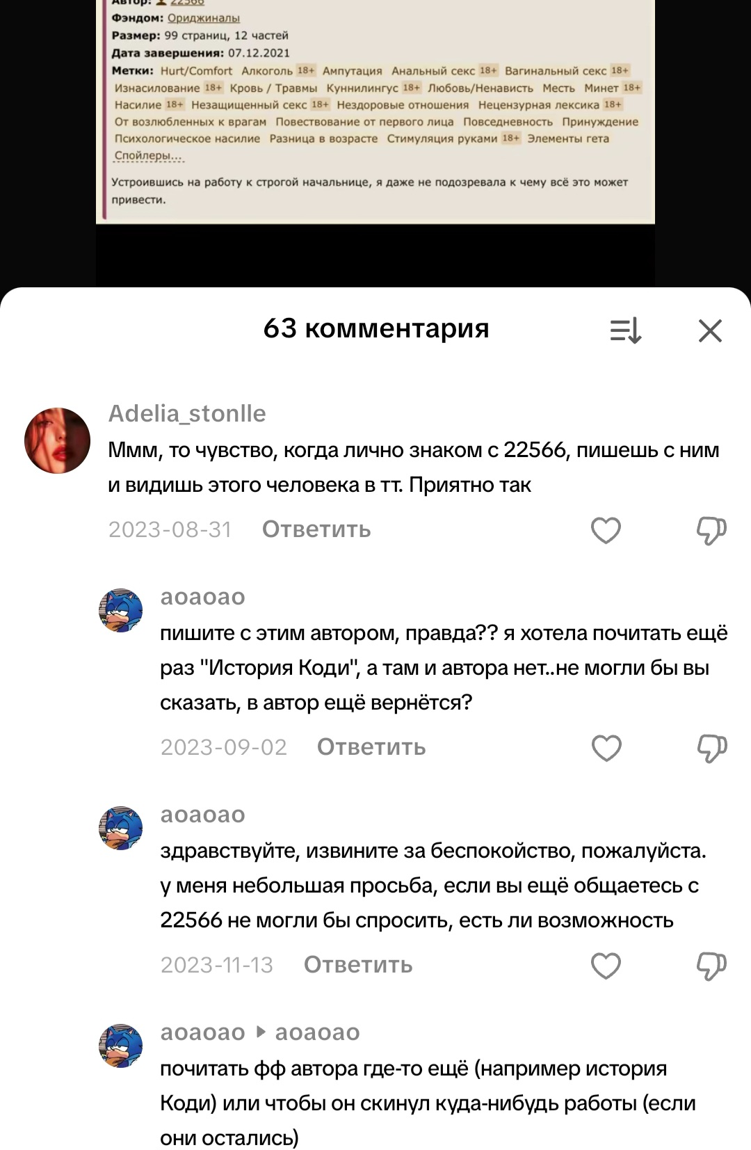 >>6365750 Не знаю, не знаю… она пишет уже восемь лет, а фанфики у нее как дискография Oasis. Она даже не пытается исследовать какие-то другие динамики или сюжеты, гиперфиксанулась жестко на садомазо с милфами. В одном примечании она писала, что не малолетка и прекрасно помнит 90-е. Лично мне кажется, что она детдомовка и ее реально в попчанский насиловали.