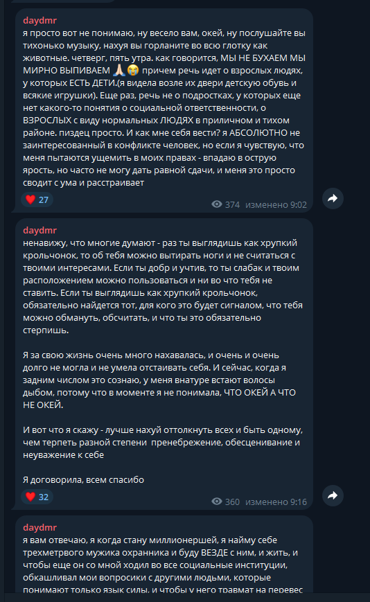 >>6393684 Согл. Могла бы подытожить тип «ну все, иду в спортзал», а она продолжила жаловаться и коупить богатым внутренним миром. Такие червихи обычно сами закомплексованные и другим шизу навязывают. Была у меня такая «подруга». До сих пор с этой суки горит