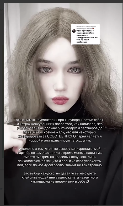 >>6392769 Двачую. >>6392735 Вот странные у нее тейки, конечно. Она с одной стороны описывает мужчин, которые ей понравились как презентабельных, а себя - как чуханку. С другой стороны что-то делать она не хочет. Получаются какие-то двойные стандарты, подайте мне красивых, а я буду как говно, мне так удобно. Я не топлю за бьютихуйни, они бессмысленны по большей части, но как-то лицемерно.