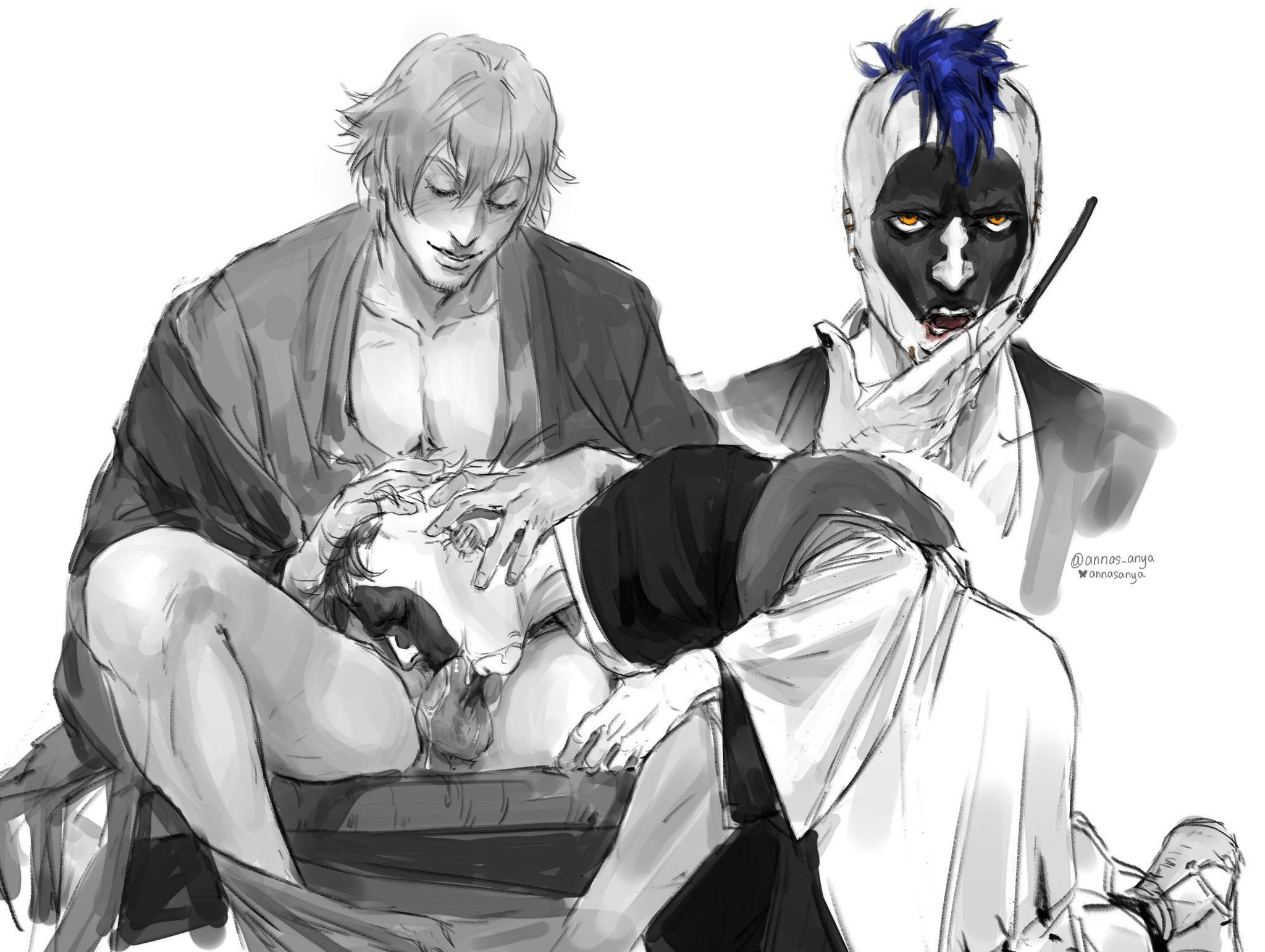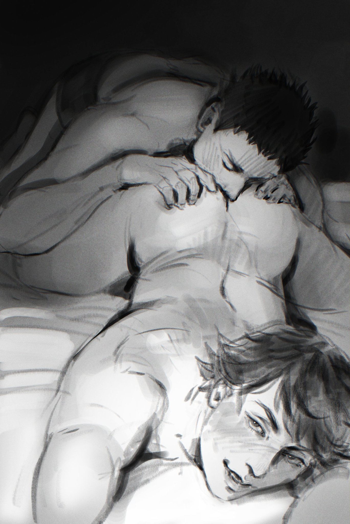 — Даттебайо, ты наконец-то мой, — прошептал он, целуя метку клана Учиха на плече. Саске зашевелился, глаза открылись — черные, бездонные, но теперь с теплом. Он перевернул Наруто на спину одним движением, Чидори искрилось в ладони, но вместо удара скользнуло ниже, заставив блондина выгнуться и зарычать. Саске вошел резко, кусая шею: "Заткнись, идиот, или весь Конох услышит". Они трахались как в последний раз — яростно, отчаянно, пока крики Наруто не эхом разнеслись по обрыву.