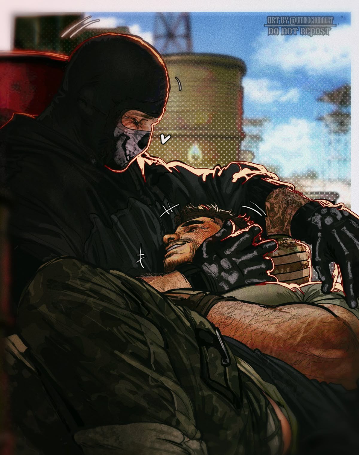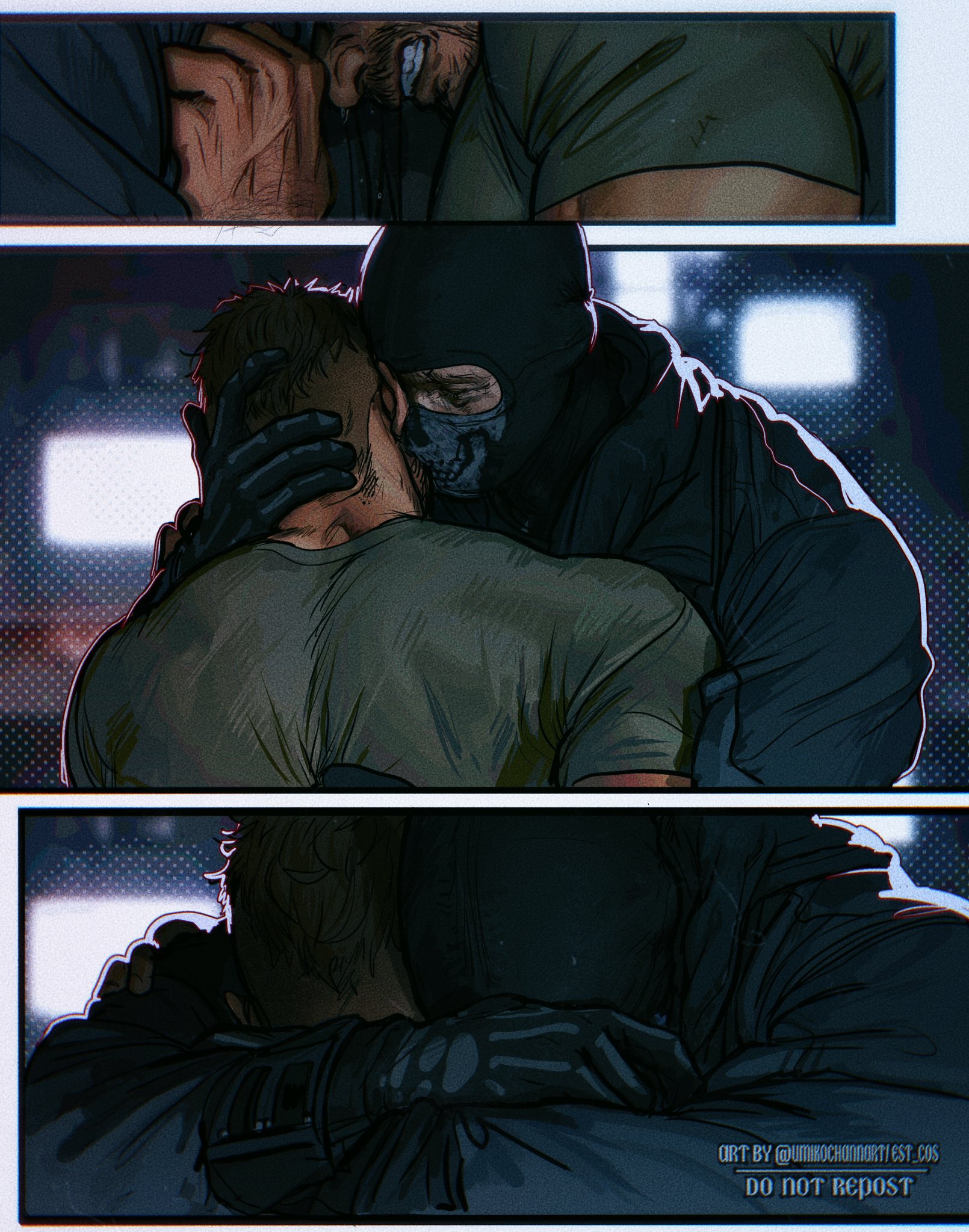 Но нет, Гоуст разворачивается, хлопает дверью душевой, оставляя Соупа одного с мылом в кулаке и стояком, который не спрячешь под уставным бельём. "Проклятье, когда же этот призрак сломается первым?" — вздыхает Соуп, включая холодную воду. А Гоуст в коридоре прислоняется к стене, кулак в перчатке сжимается: "Ещё чуть-чуть, Джонни, и я тебя не отпущу". Романтика в казармах — это когда влечение висит в воздухе гуще пара, но устав и война держат крепче любых наручников.