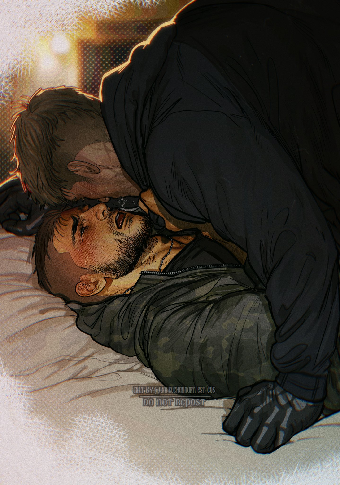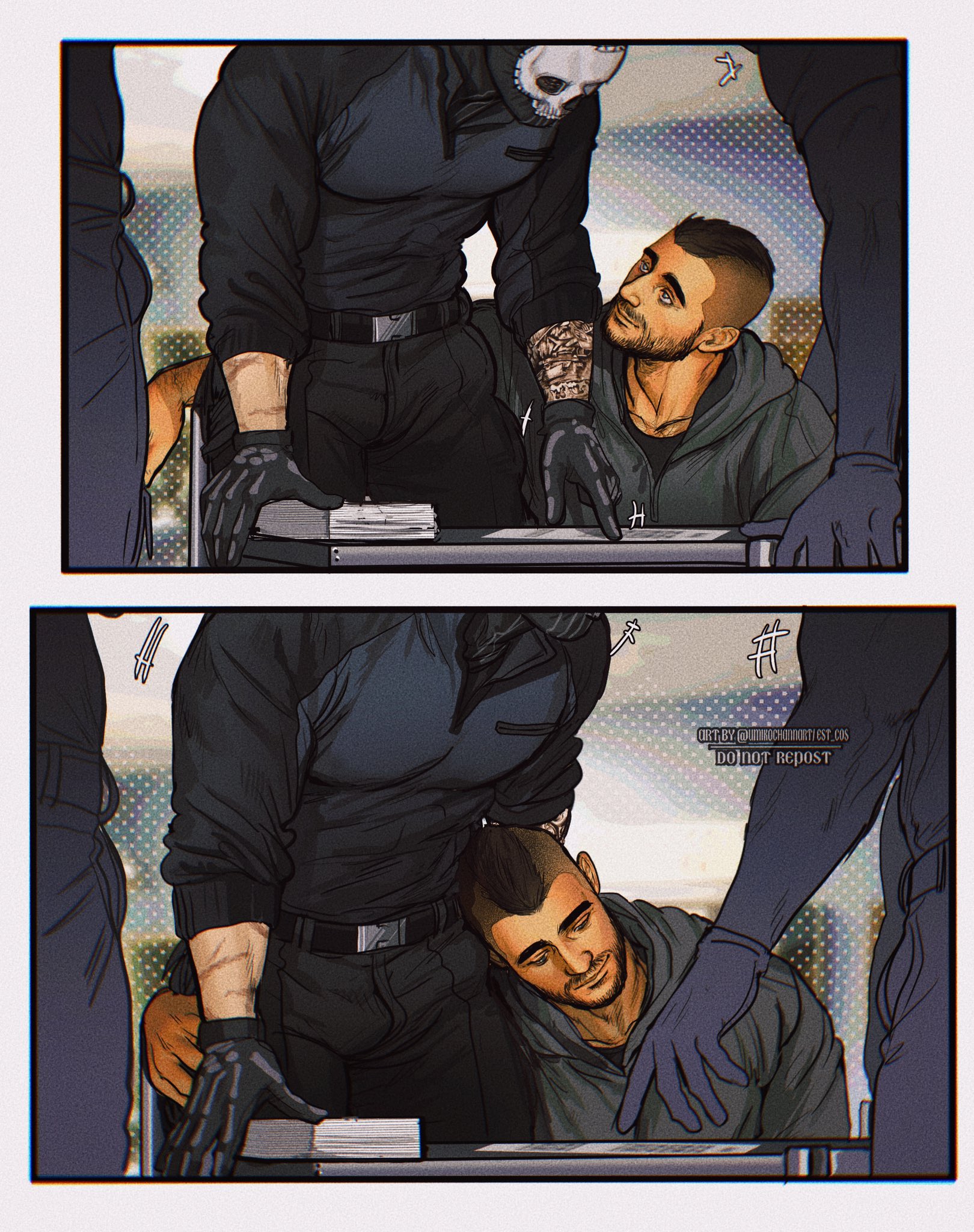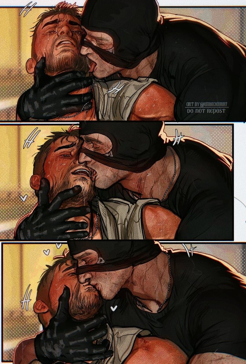 Мыло выскальзывает — классика, блядь, как в дешёвом порно. Плюхается на мокрый пол с таким звуком, будто бомба сдетонировала. Соуп замирает, лицо краснеет под бородкой, а Гоуст медленно поворачивается. Тишина такая, что слышен каждый вдох. Гоуст наклоняется, его перчатки всё ещё на руках (зачем он их не снял, а?), подхватывает мыло одним движением — грациозно, как ниндзя, но с этим хищным прищуром из-под маски. Протягивает Соупу, пальцы на миг соприкасаются, электричество бьёт током по венам. "В следующий раз держи крепче, МакТавиш", — бормочет Гоуст низким голосом, в котором сквозит не насмешка, а что-то тёплое, голодное. Глаза в глаза — и Соуп тонет в них, представляет, как срывает эту маску, как Гоуст прижимает его к кафелю, шепча "Ты мой, капитан".
