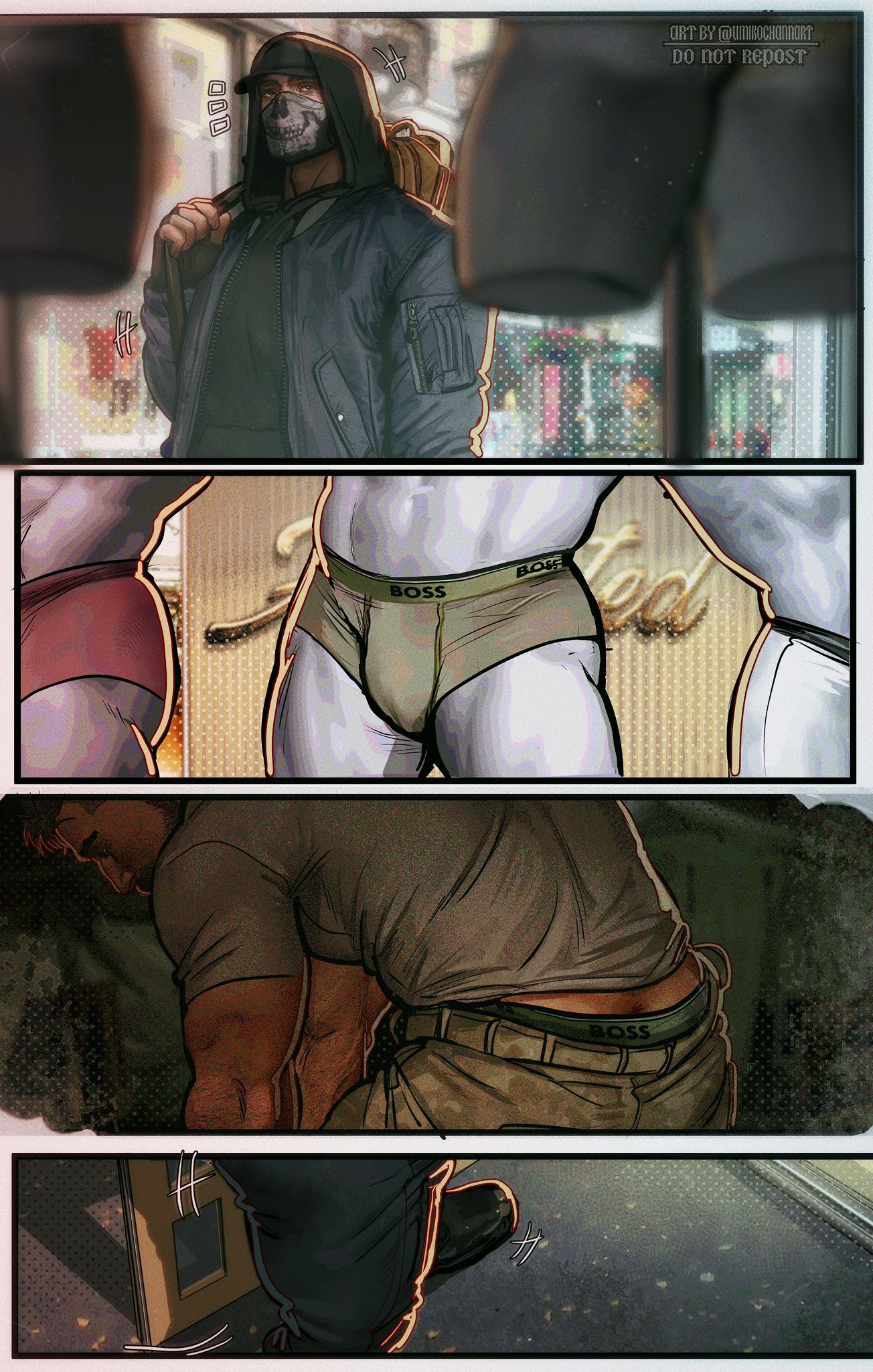 Тот был похож на каменный монолит, застывший в ожидании приказа. Его «маска» — кусок ткани от старой футболки с двумя прорезями для глаз — не выдавала ни единой эмоции. Но Хоранги смотрел не на лицо. Его взгляд, будто на прицеле, скользил вниз по бесформенному камуфляжу, задерживаясь на штанах. Форма была стандартной, но на Кёниге она сидела… иначе. Слишком тесно в определённых местах.