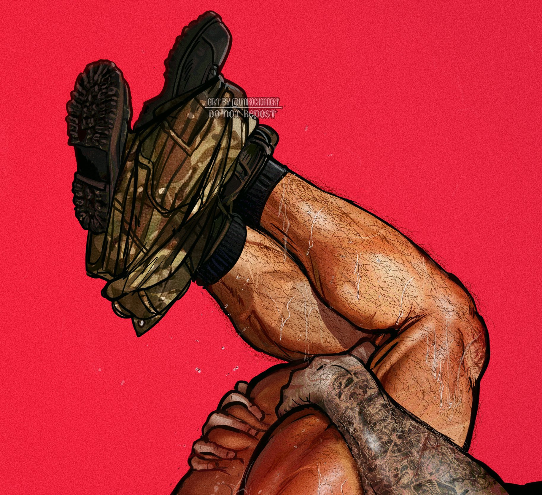 Roach приходит в себя от удушья, кашляет спермой, но Ghost уже перешёл к жопе — смазал слюнями, вставил по яйца и начал ебать в ритме "аллаху акбар". Roach стонет "Ghost, ты ебанулся?", но тело предаёт, он сам насаживается, дрочит свой хуй. Закончили взаимно — Ghost слил в кишку, Roach обкончал шлем. Лежат в луже, Ghost лижет антенны: "Лучший таракан в отряде".