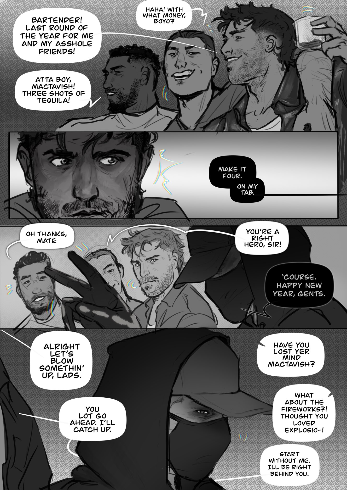 >>6408349 @monkey В душах базы, где пар клубится гуще, чем туман в лондонском метро, Соуп стоит под струёй, намыливая свою потрёпанную шкуру после очередной заварушки. Гоуст, этот молчаливый призрак в маске, уже вышел из-под воды, но завис у стены, якобы проверяя полотенце. Сердце Соупа колотится не от адреналина миссии — нет, это от тех редких взглядов под маской, от случайных касаний в бою, когда плечо Гоуста прижимается ближе, чем положено по уставу. "Чёрт, он же видит меня насквозь", — думает шотландец, и руки предательски дрожат.