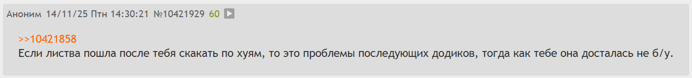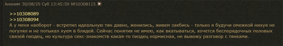 >>6403745 бля был у меня знакомый чед. в компании общей были появилась тян в компании, влюбился в тян по уши. привык что все дают ему, и когда она отказала, не в её вкусе был. "я ей цветы, на машине куда она хочет когда она хочет отвожу, я ей такой подарок на ДР сделал, никогда ни для кого так не вкладывался, а она всё ломается отказывает встречаться, неблагодарная мразь". он прям возненавидел её люто, из нашей компании выпала после этого. в какой-то момент я устала слушать это, сказала типа ну блять да, не нравишься ты ей в ответ, и чо, ну не может же она влюбиться в тебя просто по запросу твоему, сердцу не прикажешь ёпта. он меня тоже возненавидел потом. не напрямую, хуйню в мою сторону особо не высирал, я слишком олд в нашей компании была, чтобы вот так меня поносить, но иногда оч грубо чо-то говорил, шутки какие-то завуалированные, я прямо чувствовала неприязнь его пиздец, так пал в моих глазах после всех этих событий даже чедикам не всё на блюдечке с золотой каёмочкой дают, и они становятся мега отвратными, когда сталкиваются с реальной жизни. я всегда в ахуе была с залётных тян в нашей компании ложащихся под него. я ту тян жутко зауважала, что брала что дают, но верна осталась себе. поиспользовала чедика так, что мир перевернулся у него. хотя она даже не стейсуха 10/10, обычная 6/10 среднетян