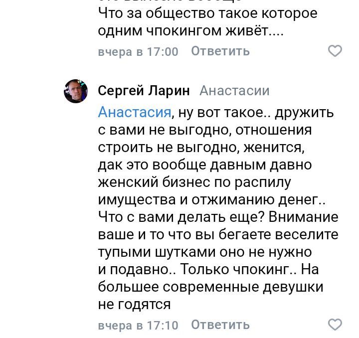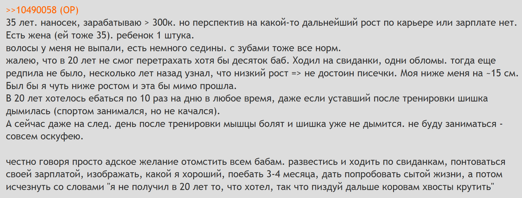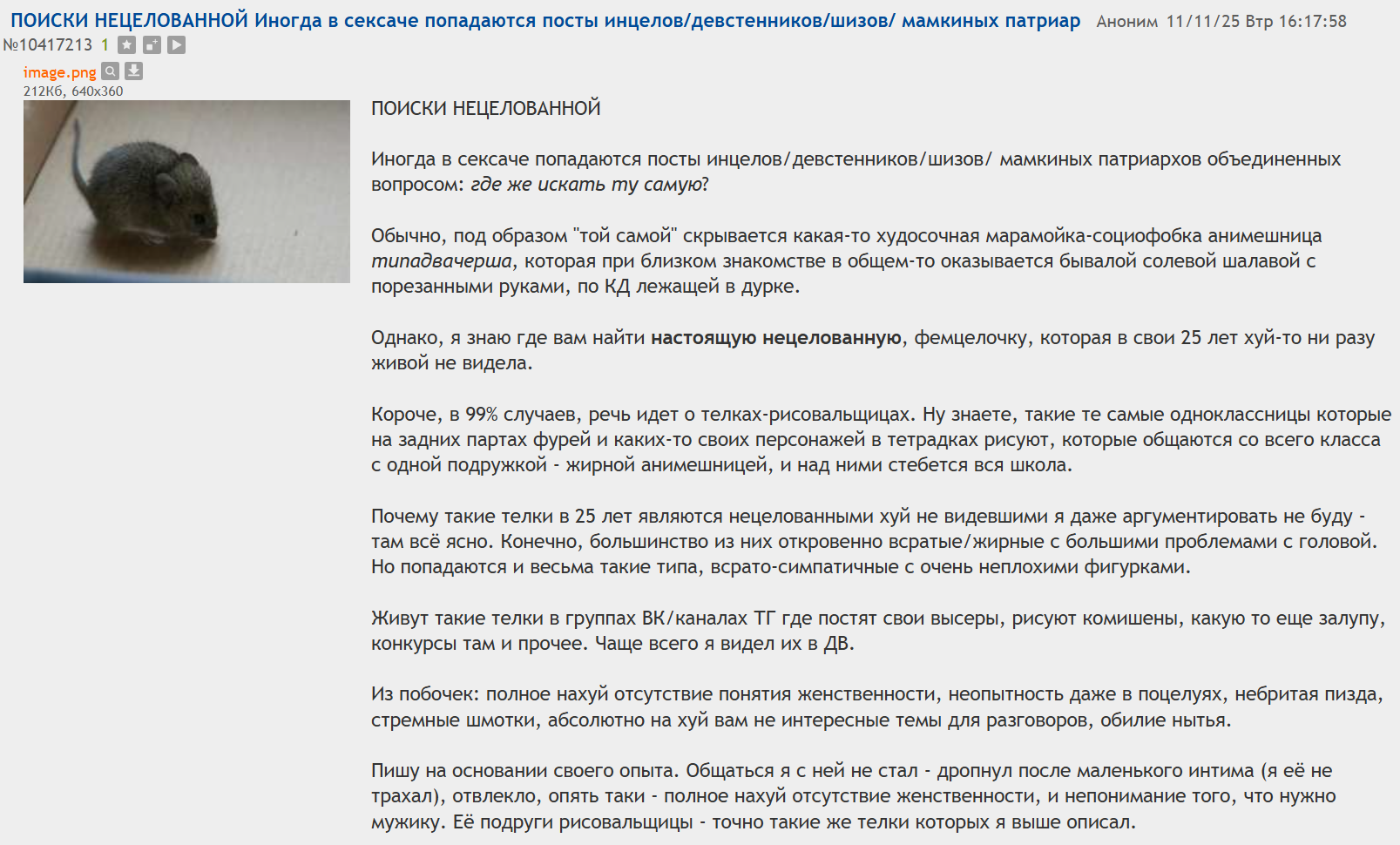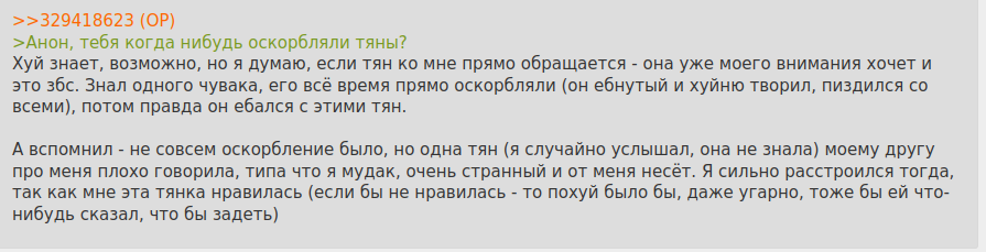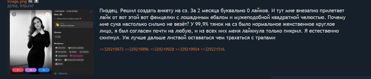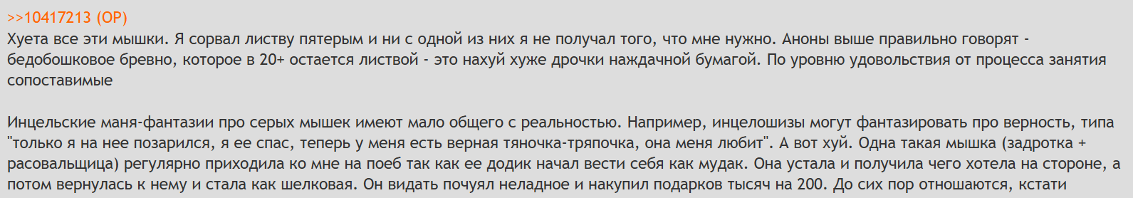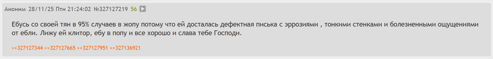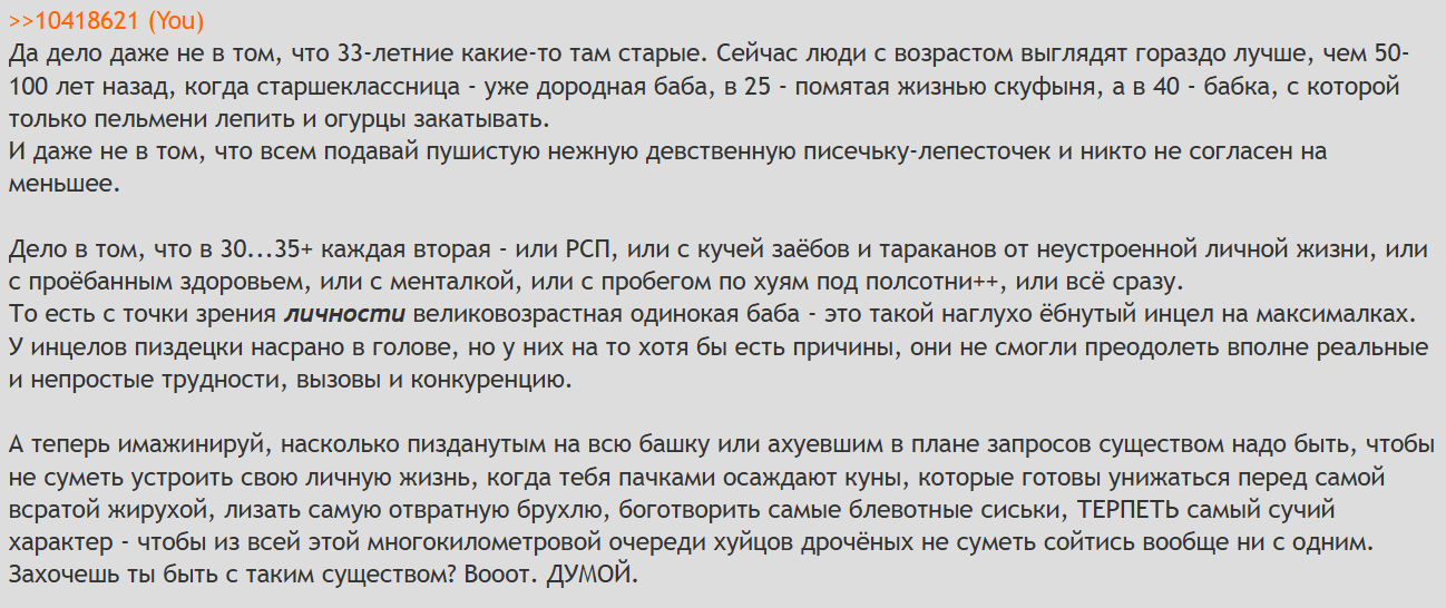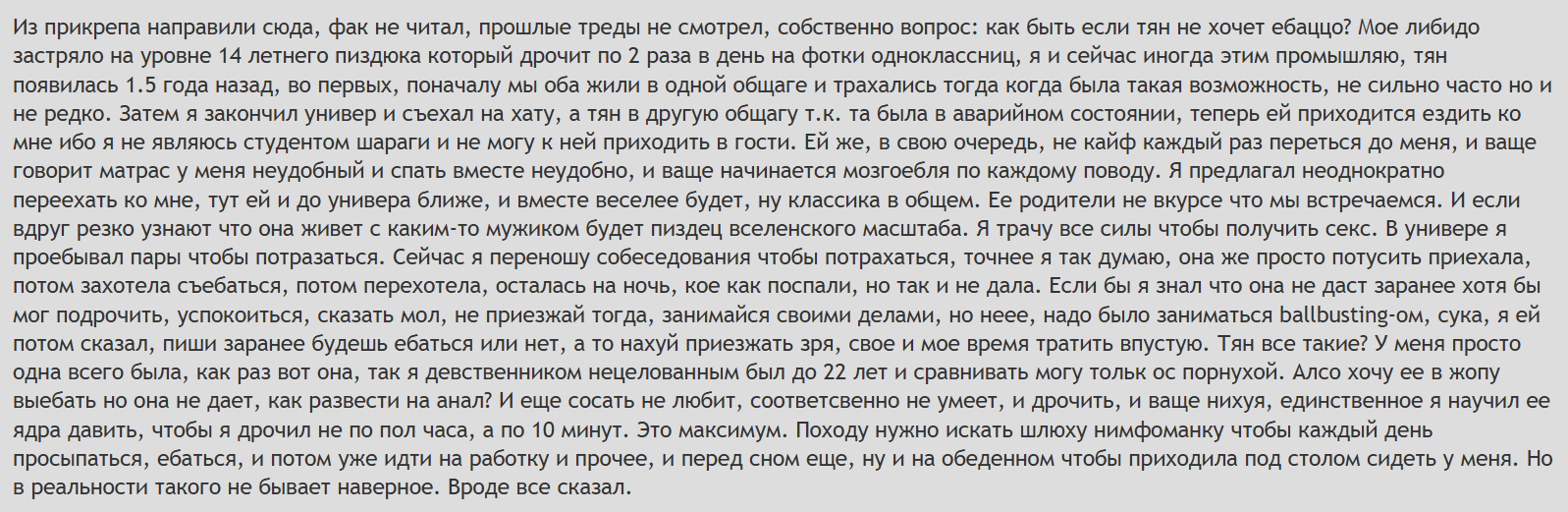 >>6409995 Объясни мне блять пожалуйста, как к ЭТОМУ можно относиться нормально? Ты скрины под этим тредом почитай, волосы встают дыбом от того как именно инцельская свинина воспринимает и смотрит на тянку. Нытье тян тут связано в общем с тем что нас даже не пытаются уважать, пока подобье мужчины ноет из-за того что бабы НЕ ДАЙ БОГ не дают, говоря об этом так, будто единственная функция женщины это режим давалки, ноют так же из-за того что в браке нужно поднять жопу и что-то делать, а не гулять на лево. Тут в каждом скрине прослеживается полная обьективизация отношений, женщин в целом из-за чего читаешь и аж слезы наворачиваются от того как на нас смотрят, и это не один два человека, а добрая такая стопка паханов. При чем важно, хуймрази когда говорят о женщинах говорят о всех женщинах, пока тут тянки говорят про КОНКРЕТНЫХ типов, инцельской блядине