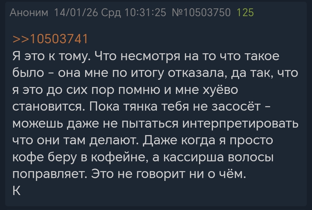 >Даже когда кассирша поправила волосы >это ни о чём не говорит Что-то в голос проиграла с этого чуханского открытия, они по дефолту обычные неосознанные жесты воспринимают как флирт, лол