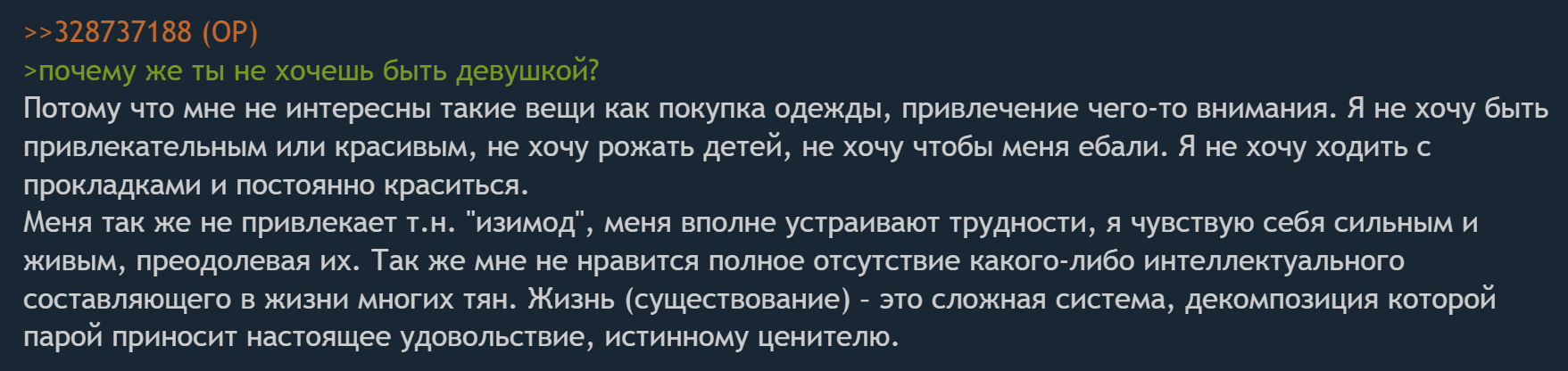 Хуй заправь, тянка. Вы просто ведомые и трясетесь за моду и иерархию в компании ваших латентных гомиков-друзей.