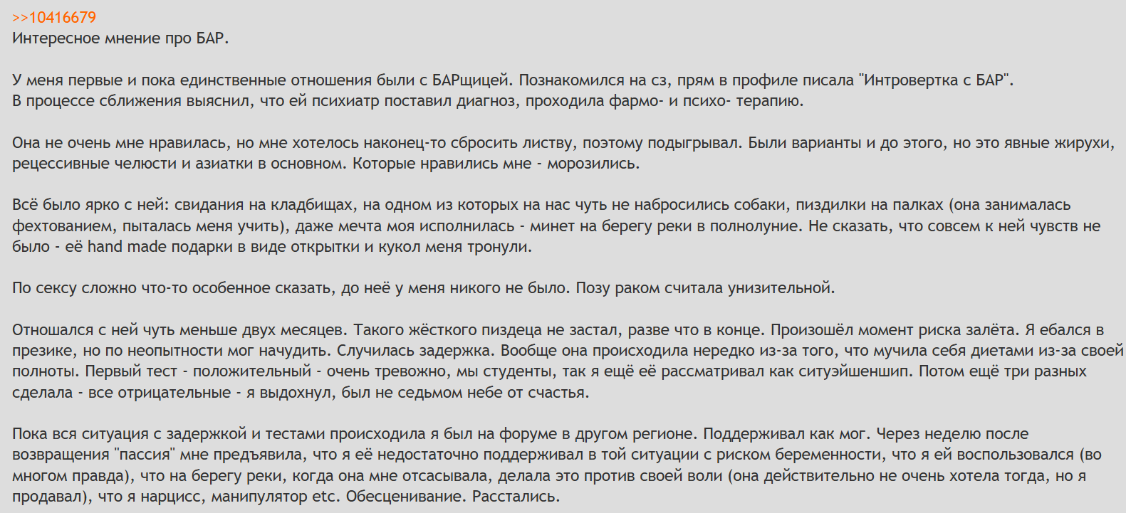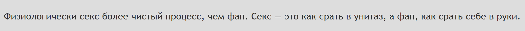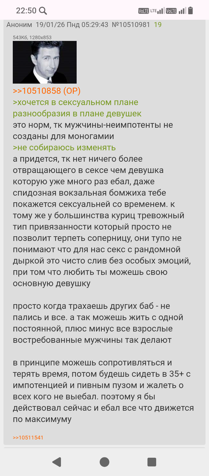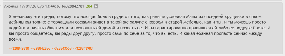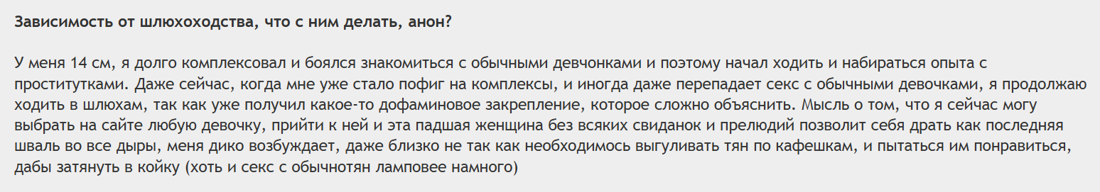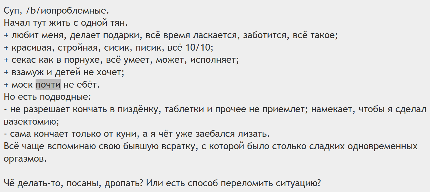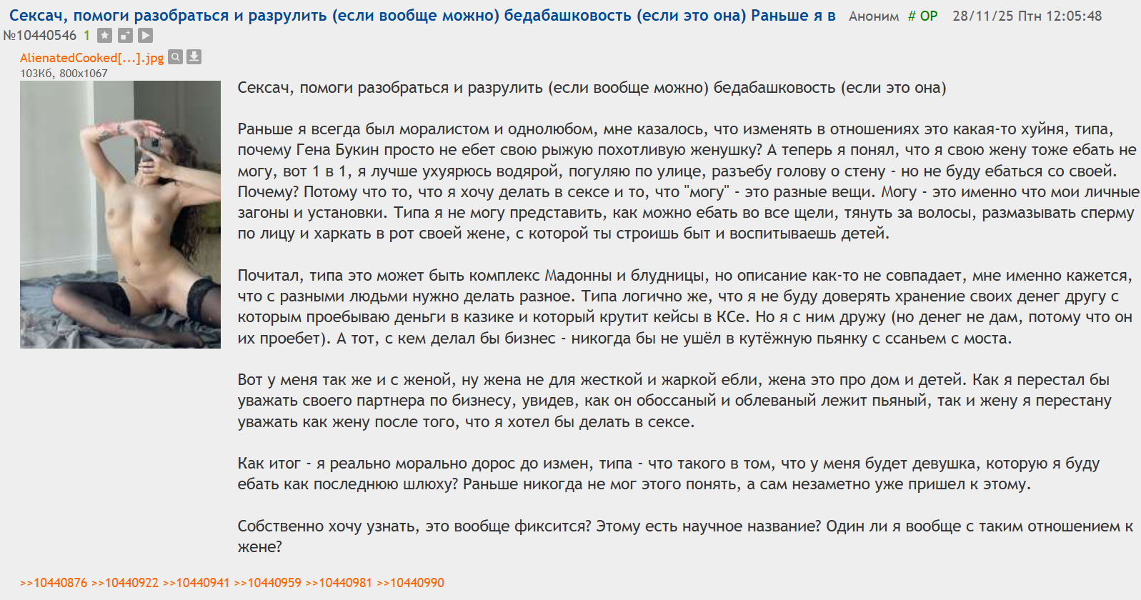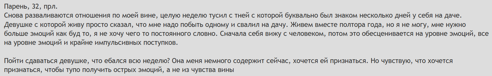 До блевоты противно представлять, что его хуй может побывать сначала в левой пизде, а потом он придет и мне привсунет. Хочется буквально рвать волосы на бошке от безнадёги и отвращения. Почему нужно было делать этих существ настолько скотоподобными? Одна из многих причин почему я больше никогда не выступлю в отношения. Только АВОКАДИНГ.
