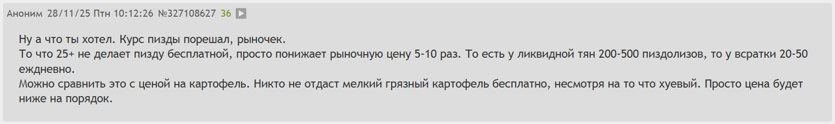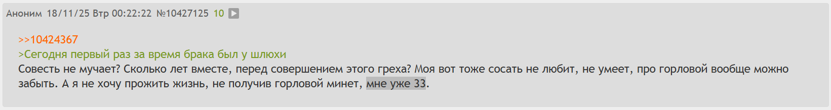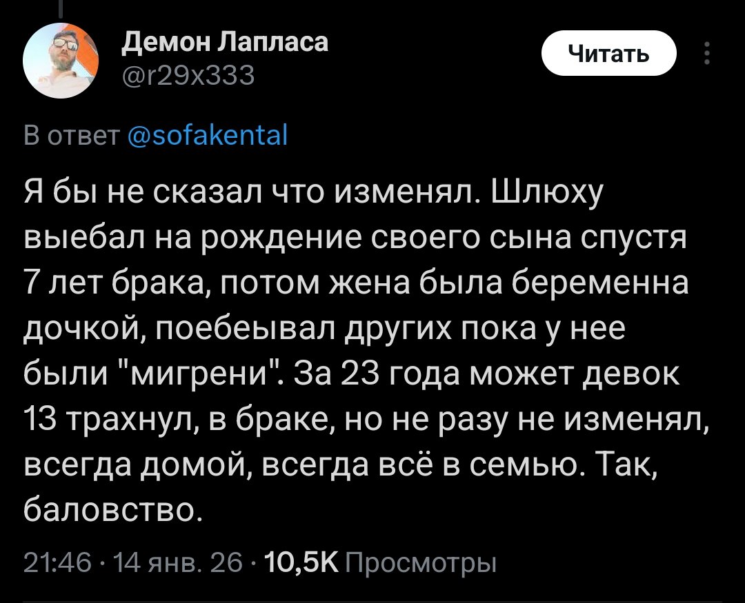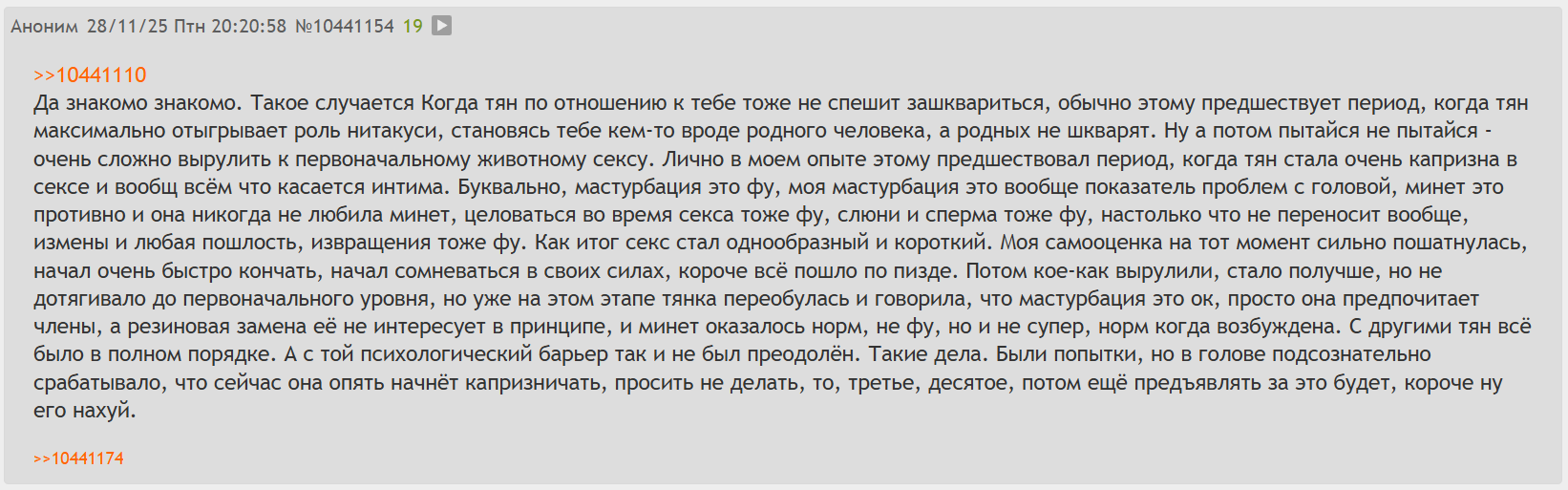 >>6438223 Он просто ахуел. Каждодневный секс — точно такое же элитное потребление. Такая же эгоистичная придурь и хотелка, как сто роз каждый день. Это про потребление и про поставить своих близких раком. Про доминацию и утвердить иерархию, что его желания тут главнее всего. Просто некоторые женщины и мужчины привыкли с мужскими хотелками носиться как с писанной торбой. Истерить, визжать, топать ножками и прочее. И жены их кудахчут - как же так, моему масику не сосали ровно полдня, все, он умирает, еще час и скорую вызывать пора будет. Одинокие мужчины спокойно дрочат и ничего — живы и здоровы. В паре должен быть секс, но история про "каждый день" и мужские истерики - это чисто про то, чтобы жену выдрессировать как собаку на подчинение и показать ей место.