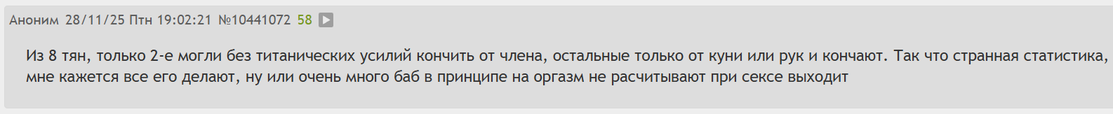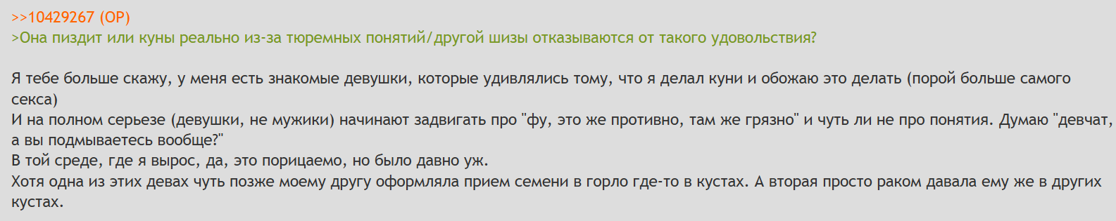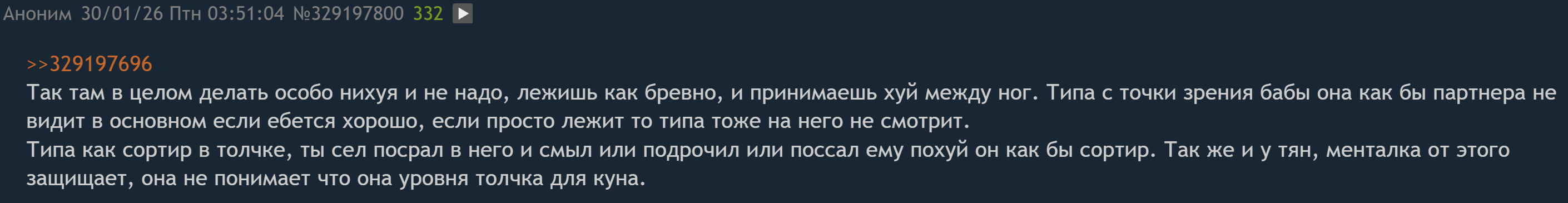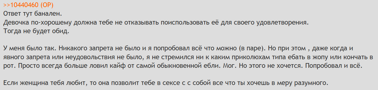 Мужики кстати пишут что любят минет не из-за каких особенных физических ощущений, а из-за чувства доминации над тян) и анал любят по той же причине) Но тян по их логике должны любить унижаться