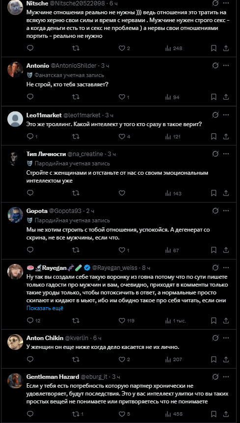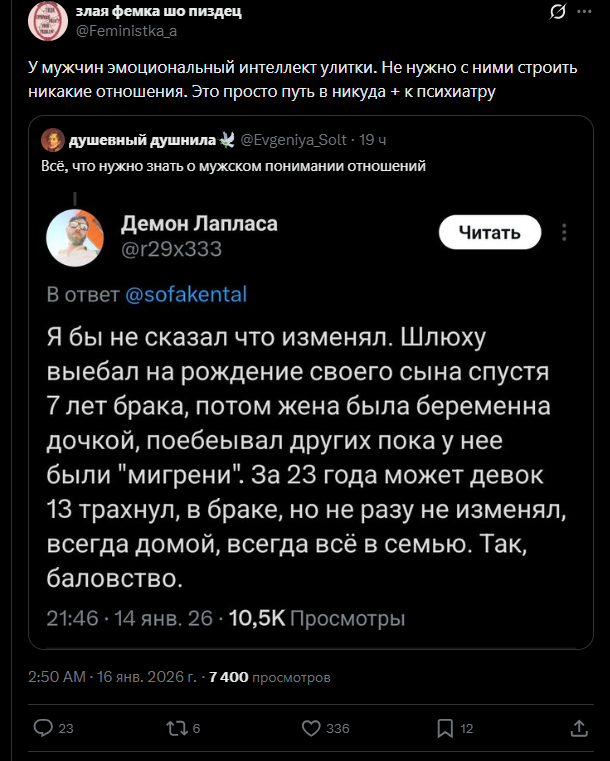Так и должно быть, надо отличать диалог от срача. Когда мужик говорит про феминицид, скажи что сделаешь аборт, если будет мальчик. Что мужчины ниже 190 см это мусор, что мужик по факту обязан. Тебе надо поджечь собеседницу жопу, а не просветить