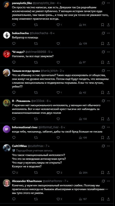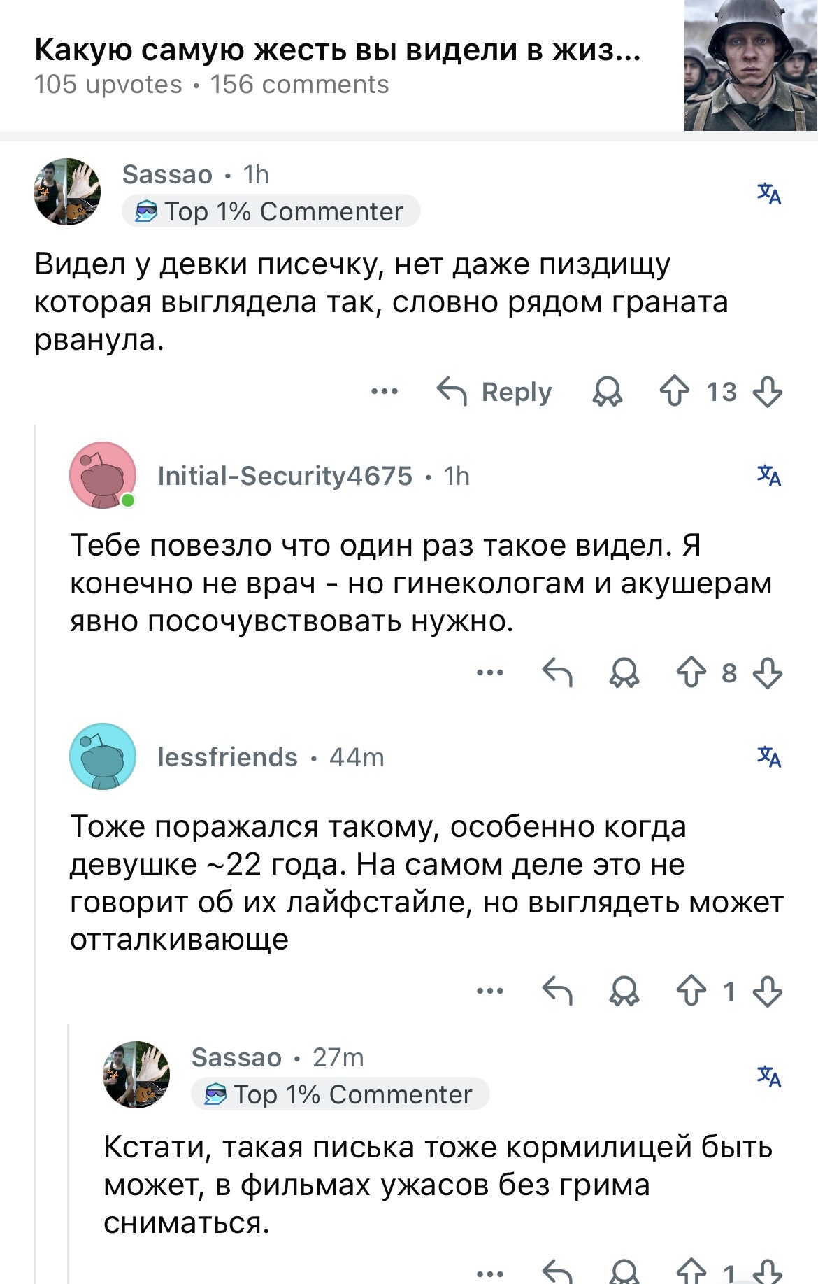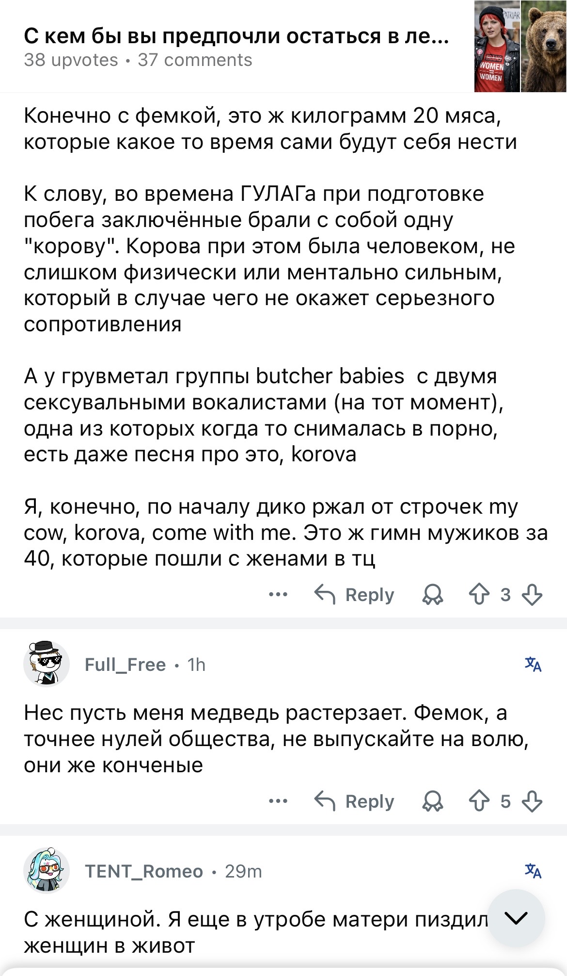 >>6420883 Всж сабы на реддите это вообще пиздец. Реддит в целом мизогинная помойка, но на англоязычных сабах я не раз встречала адекватных кунов, даже в чисто мужских сообществах. Русскоязычные сообщества же полны мизогинной швали. Отражение менталитета, хули.