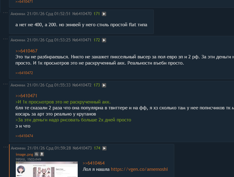 Сначала меня бесила ее упертость, а сейчас стало грустно, ну наверное работяг расстраивает что кто-то такие большие деньги лутает на своем навыке которым интересно заниматься. Мне вот тоже не верится что можно 1к долларов за арт получить, вот бы я так жила, жаль что нет толанта к красивому и интересному, сколько ни училась рисовать.