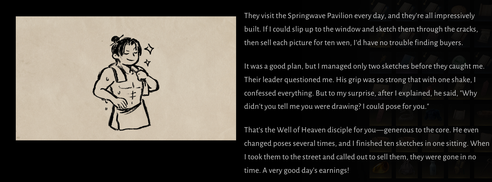 Идея хорошая... а вот черный экран - это моветон. Даже в самых задрипанных ВНках хотя бы пару пнг ставят на сценки, если не полностью анимируют. А тут буквально нихуя, нехорошо..