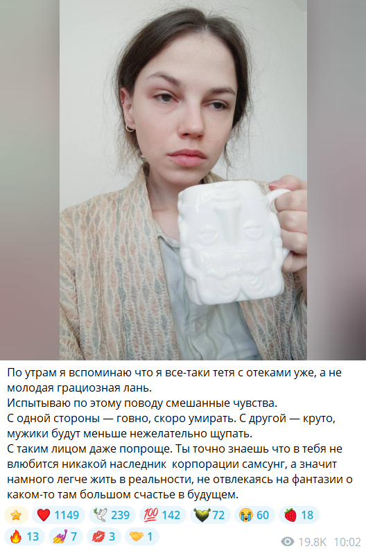 >>6423087 > выбирают они все равно смотреть на хуй своего герпесного скуфа. Ну значит так надо им. Таким в принципе никакой хуй не интересен >Не вижу такого, чтобы старые тётки ебали кунов. Если ты не видишь не значит что этого нет. В инсте дикий форс милф кстати. Кто ж виноват что нашим бабам комплексы жить мешают? Вот ты кстати одна из них по твоим тейккам, не уверенная в себе > Откуда ты знаешь, что у нее кто то был красивый. Вот у её мужа, который ей изменял, были красивые эскортницы. А ты откуда знаешь что не было? Но если и не было - исключительно ее вина. Кто виноват в ее низком либидо, тоже мужики себе забрали? Возможность у нее была постоянно > Таких дохуя. Не видела, давалки обычно страшные или максимум среднетян, красотка банально не опустится до такого. Там самооценка низкая очень у таких