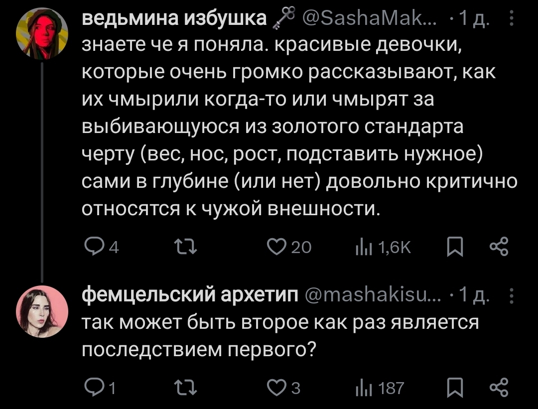 >>6423059 > А почему ты думаешь, что это есть? Как минимум потому что открой инстаграм и читай комментарии от женщин под залетевшими рилсами хотя бы минимально привлекательных мужчин. Та же сексуализация и слюни до пола. Просо женщины долго сдерживались и молчали. Это все еще в тени > Они получают от этого сексуальное удовольствие точно так же, как и от секса где тебя хотят без денег. Им без разницы. Не так же. Это конченые социопатища только. Куны любят комплименты, любят коупить что они хороши в сексе, больше всего их волнует размер своего члена, если скажешь чтт они плохи в сексе это наверно худшее что можно сказать чушку. Было б им похуй так бы не загонялись. Даже скуфы в щлхотреде коупят что проситутка с ними кончает и влюбилась в них