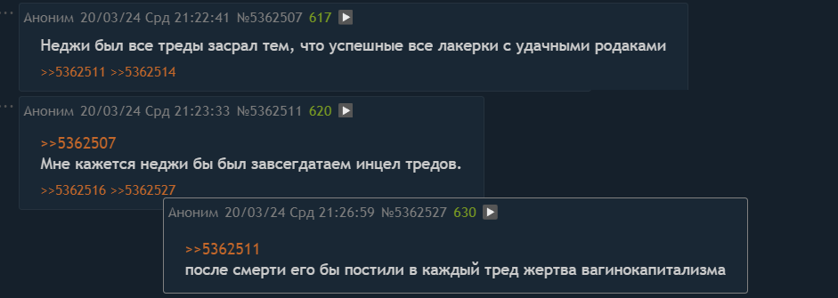 Считаю, что настоящим хасу может быть только кто-то вроде Саске. То есть красивый, умный, загадочный, из элитной семьи. Все остальное это потворствование скуфиному изи моду. Меня пугает вот эта тенденция боготворения пряников, старичья, или бомжей без роду и племени. Даже через культуру идет понижение женских стандартов. Просто задумайтесь, даже в фантазиях позволять себе дрочить не на тру 43дикса (Саске), а на какого-нибудь задохлика Дейдару. Или неиронично занюхивать за карликом Леви. Просто сегодня мечтаете о Астарионе (плесневый дед), а уже завтра строчите в директ скуфу из пятерочки.