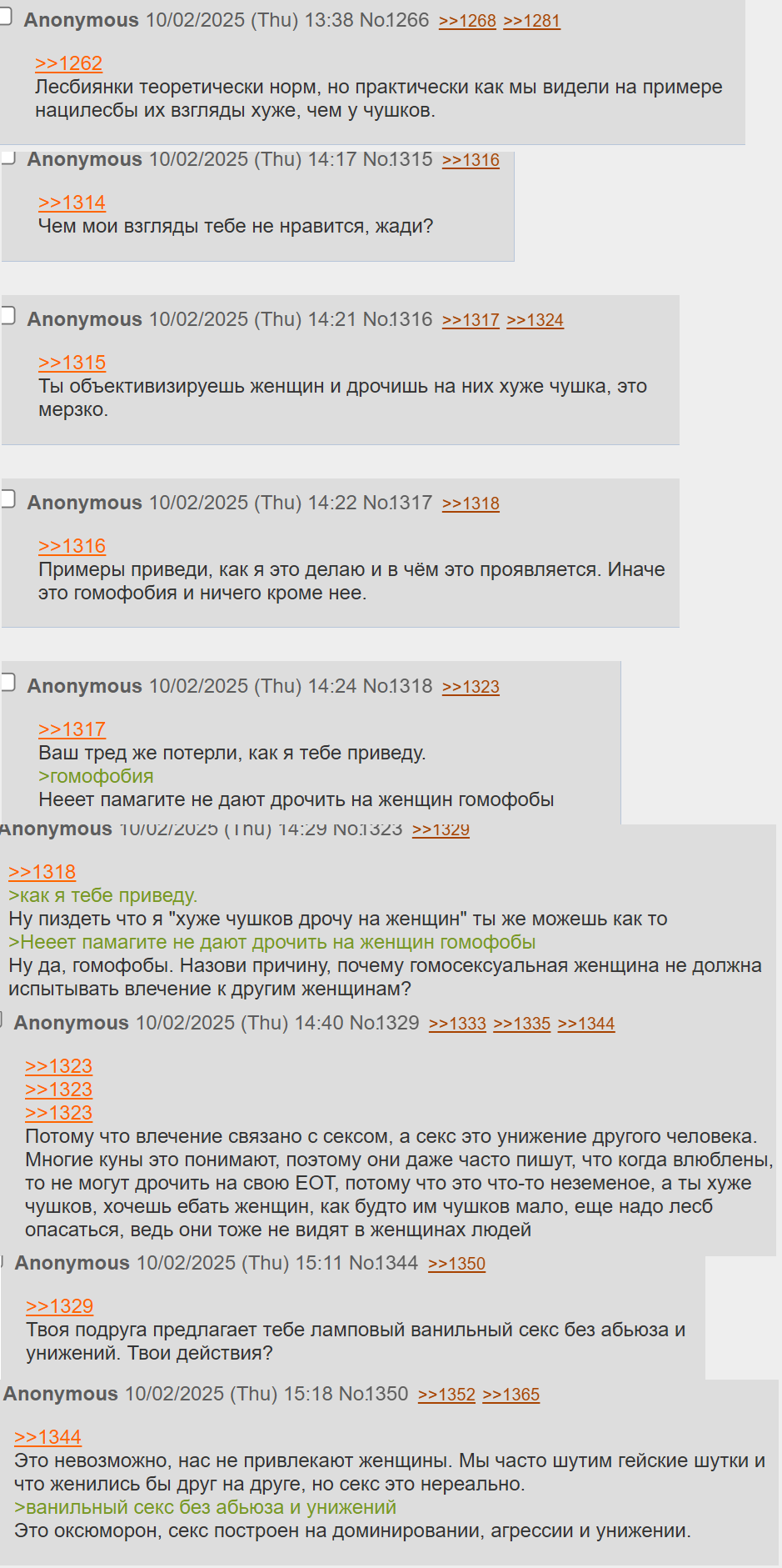 В гл кстати был пост от чулочника, в котором он ныл мол как посмели лесбухи плохие "сводить женщин до гениталий", "они любят только тех у кого правильный писик" и тд. Его обоссали и потерли, это было летом-осенью. Щас начинаю думать, что это тоже высеры жади
