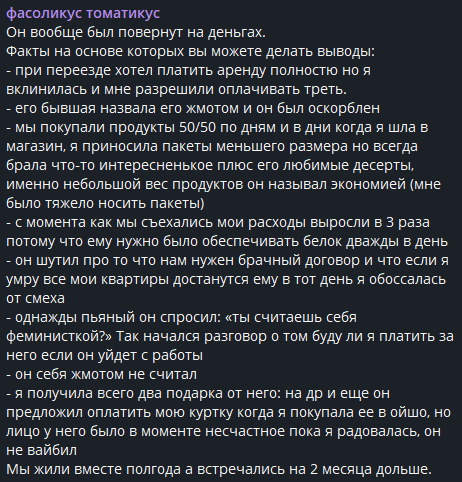 >>6446484 >она в аффекте после этой истории Блин, ну больше полугода там прошло по лору и она это все творит. Аффект так долго длится? >>6446468 Воо, мои мысли описала. Не просто так они все столько лет общались. Скажи мне кто твой друг и я скажу кто ты. >>6446425 >Обсуждение ситуации с подругами и реакция Миши Рассказчица поделилась ситуацией с подругами в чате, подробно описав все мелочи и массажи. Подруги подтвердили, что её чувства оправданы. При чем и подруги, помимо злосчастной, имеются. И все поддерживают. Но таким нарциссихам мало, надо больше и больше высасывать.