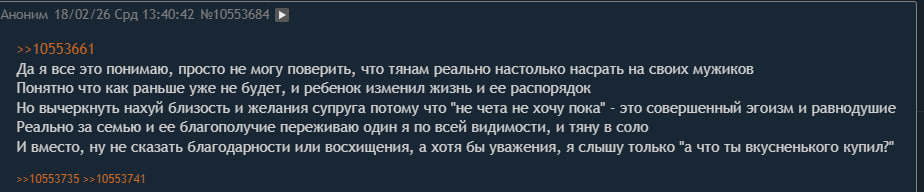 >>6447450 Ну все таки у них редко бывает что тянка уходит к другому хую, а он винит этого хуя. А вот у тянок часто С изменами тоже самое. Мстят сразу тянки и ооочень редко любовнику >>6447451 Он был лохом в компании 100%. Такое не происходит с тем, кого хуи уважают. Они на его тянку даже посмотреть боятся. Твой был таким омежкой.