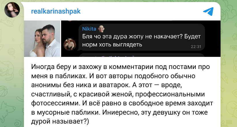 >>6447250 да выдумала она всё. Причем она то создает каналы про что-то, то удаляет. Тематика всегда разная. Она просто хочет найти тему для того, чтобы прославиться, хоть как-то. Найти тему которая зайдет аудитории и постоянно прощупывает почву в разных местах. Даже история про психолога абсурдная. Девчонка сама из РБ. Но счет ведет в российских рублях. Причем так прилично она в свои 22 года в месяц отстегивала психологу 20к рублей, как она сама пишет. То есть она даже в посте про психолога ориентировала его на русскую аудиторию прежде всего. Вроде пост про обман и ее страдания, но про ЦА она подумала сразу и создала отдельный инстаграм для травли психолога ориентированный чисто на рф. Короче, разводка это для странной славы. Я так понимаю, что та история выстрелила, в ее понимании, и теперь она ищет темы, на которых сможет выехать так же.