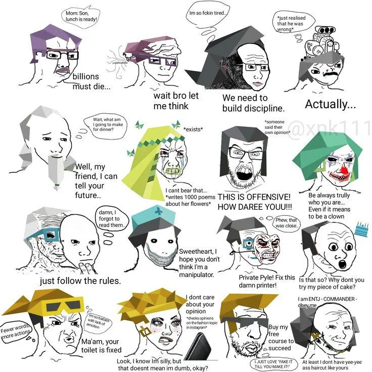 Как же тяжело базовому интуиту, окруженному болевыми. Эти люди боятся пробовать новую еду, идти в новое место, лететь самолетом вместо того чтобы двое суток пиздохать на поезде как привыкли. Они боятся завтрашнего дня, будущее для них туманно, их пугает собственная тень. Они совершают какие-то глупые ритуалы для самоуспокоения, но это лишь иллюзия контроля. Как глупо это выглядит со стороны... Я литрали задыхаюсь рядом с ними!