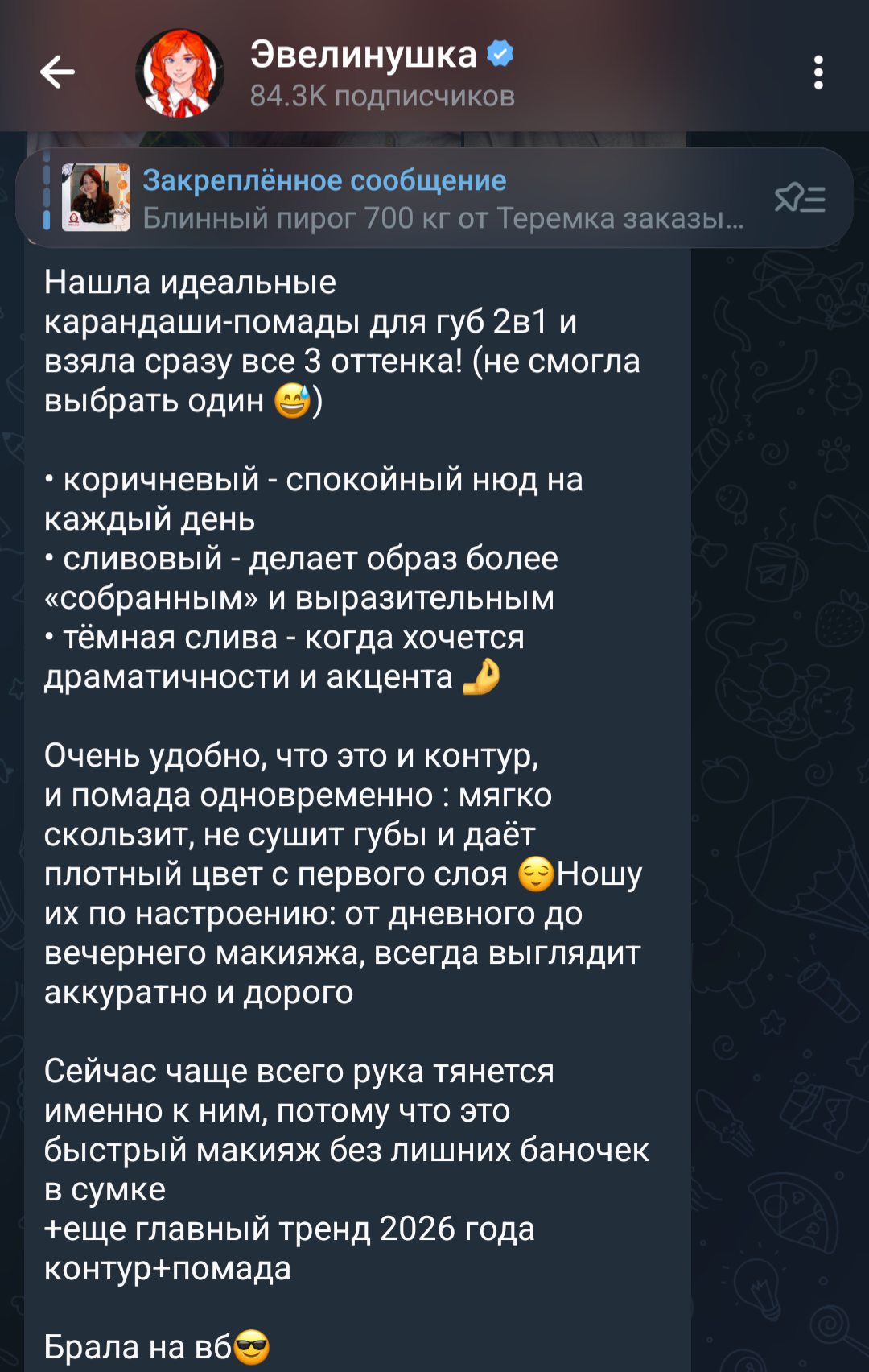 >>6456473 Мне нравится, там у неё какие-то светлые тени ещё, без ресниц получается прикольный контраст с тёмной радужкой глаз. Если бы при всём этом нормальный акцент на губы сделать, без эффекта усохших старушечьих губ, то было бы супер.