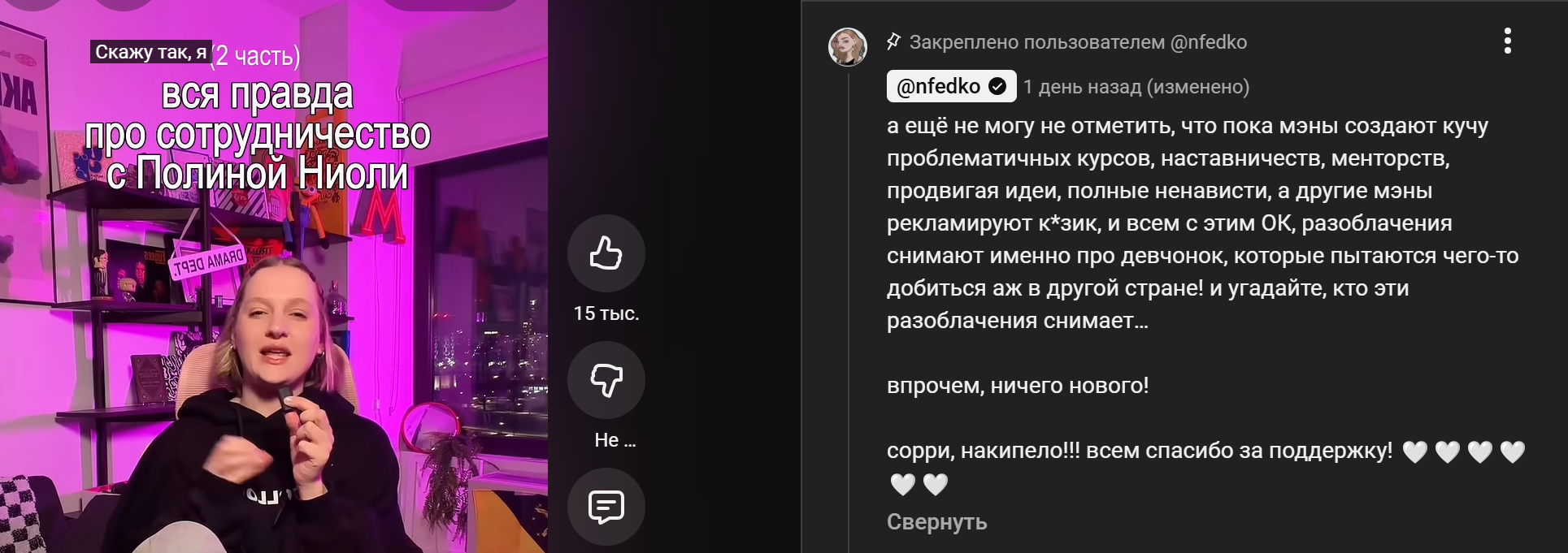 Лизон там уже совсем кроет на собственную аудиторию хомячих Даже тогда, когда ей писали о том, как она утомила своими отношашками, то ее так не рвало, как сейчас, уже совсем фляга свестит, последний месяц только пассивную агрессию от нее читаешь Правильно говорили, что она из тех, кому просто нужно устраивать драму на ровном месте, жду превращение в Консерву