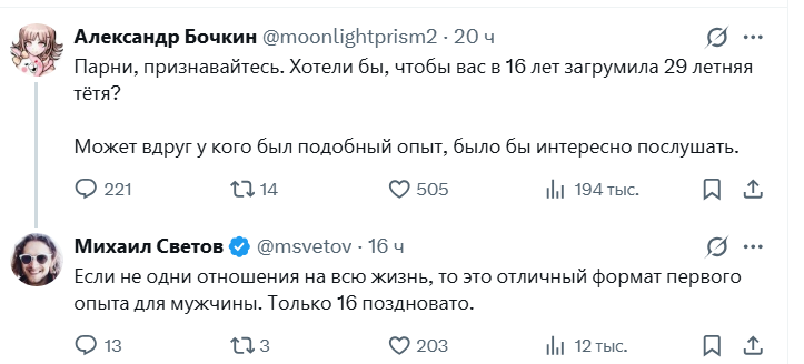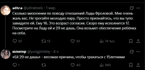 В твиттере вой про еблю той 29лвл альтушки и ее 16лвл кунчика, их сюда носили, пока повсеместно скуфы ебут девочек подростков и всем похуй, да тот же продюсер-скуф, который отношаться начал с тянкой, когда она еще несовершеннолетней была и всем похуй опять же, не обсуждают так как этот кейс