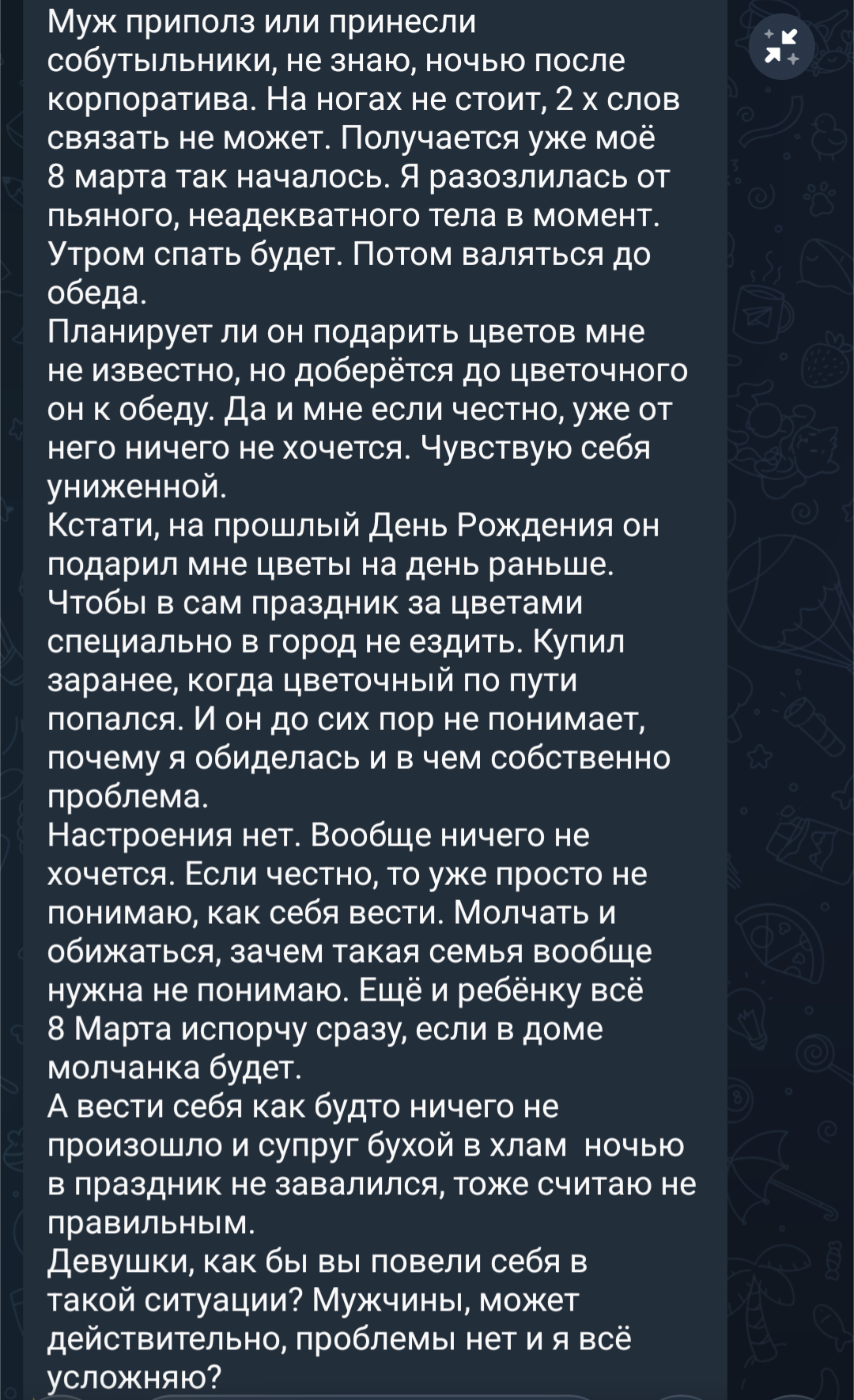 >>6461316 На одно 8 марта нам дарили зонты и еще чет, так чел мне просто его кинул)) пришла домой и расплакалась, а одна стейся мне втирала что это я вообще охуела раз недовольна, потому что ей цвет зонта не понравился)))) а у меня типо был черный и ей он был нужен