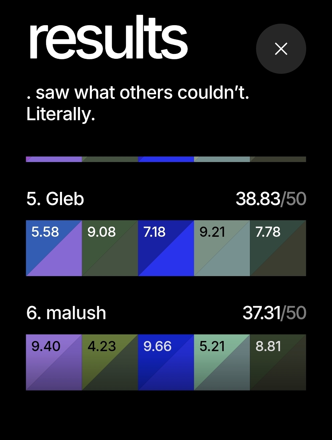 Такое получилось. Да ну, это нереально угадать в точности. Был тест, где надо было расположить цвета по радуге, там было много переходных оттенков. Я запуталась в сине-зеленом спектре, 4 кажется цвета перепутала местами, мне реально трудно было определить, какой из них более синий, а какой более зеленый. Ну я по жизни в этих оттенках путаюсь.