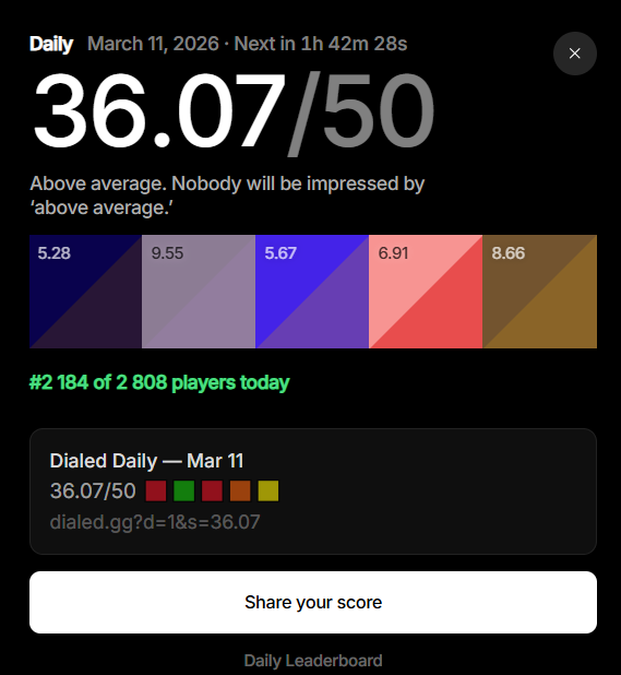 Мультиплеер (загаданы одни и те же 5 цветов, все угадывают их, можно сравнить результаты) https://dialed.gg/?c=BDNPYE