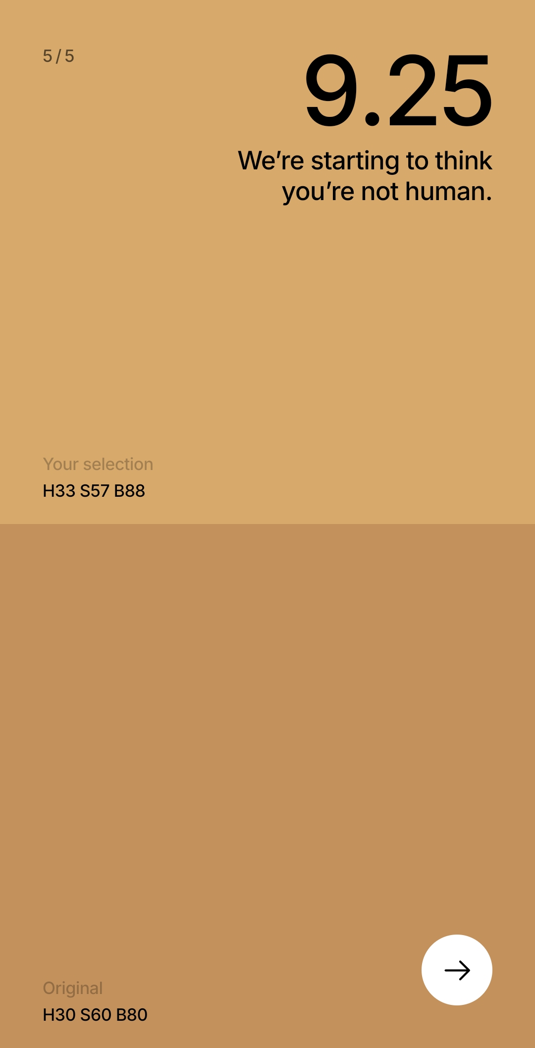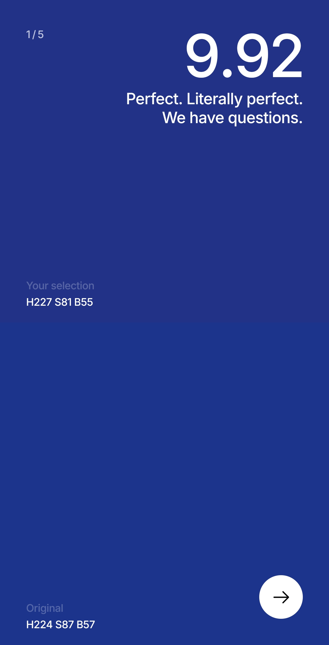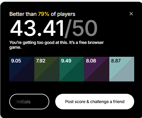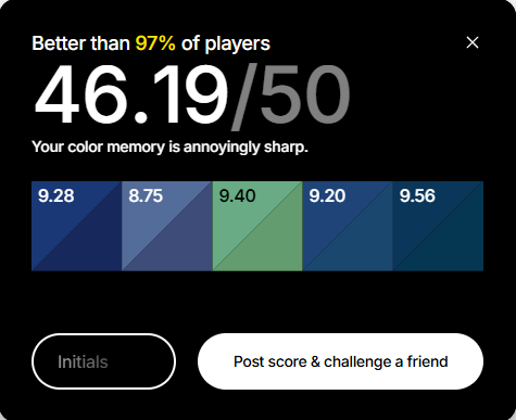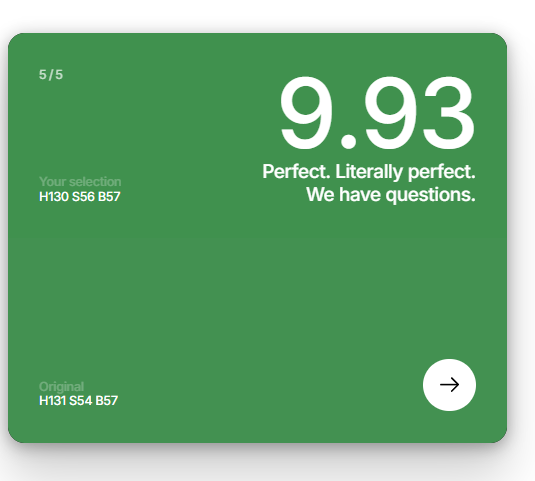 Цвет появляется на экране, запоминаешь его, дальше пытаешься его повторить, двигая ползунки. И так 5 раз. Каждый результат игра токсичит, если угадываешь цвет не очень хорошо, кек. В конце считает общий результат.