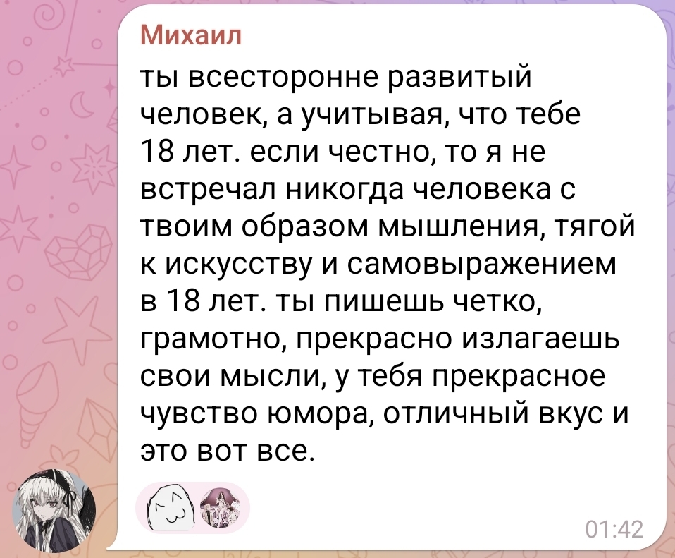 Кто-нибудь следит за Бибси? Косплеерша, но кошмар какая невезучая. Типа какие-то челы ей угрожали, наебывали чухов ее фотками, в вк тоже какая-то девочка себя за нее выдавала и всякую фигню писала. Создавали тг-каналы со сливами, пересылали сообщения, где она просто рассказывает что-то. На складе вб работала, ушла из-за того, что кто-то ее узнал там и начал распускать слухи. Я сама чет следить перестала, когда оказалось что все сливы правда и она реально пыталась в вебкам. При этом говорила и говорит, что никакого 18+ контента делать не собирается. Бывший парень вроде обещал выбить зубы или что-то такое. Ей еще одногруппницы гадости писали и все такое. Причем как я помню у ее родителей большой дом, но она все время по съемным хатам прыгала, как-то с друзьями жила. Щас вроде в Москве. У нее батя художник кстати Мне ее жаль все таки( а еще имхо она ебать красивая