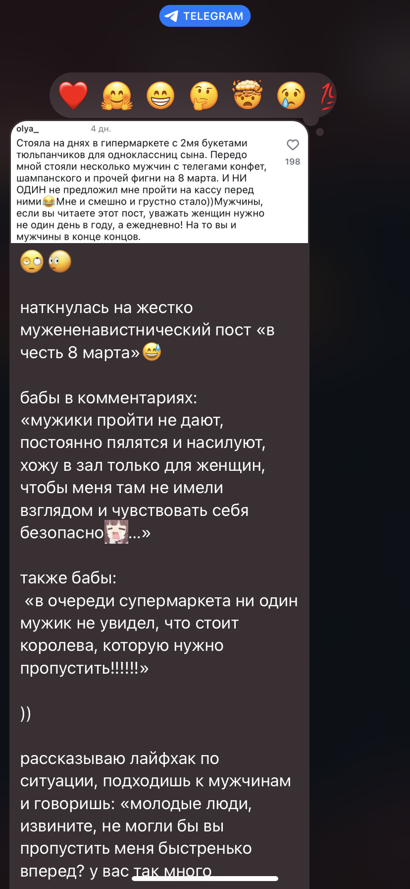 Вы тут говорите всж ад всж ад. Пришли фотки с корпората с 8 марта с работа. Скуфы и прочие чушки уродливые пиздец. Но блять тян коллеги... Я не знаю, то ли ракурс, то ли свет, но нахуй все какие-то хуже чем в жизни. У зумерш носогубки и морщины. У женщин постарше вообще пиздец. У меня аж отлегло немного (я и не фоткалась зато), я загоняюсь постоянно из-за внешности, казалось я на фоне их мышара.