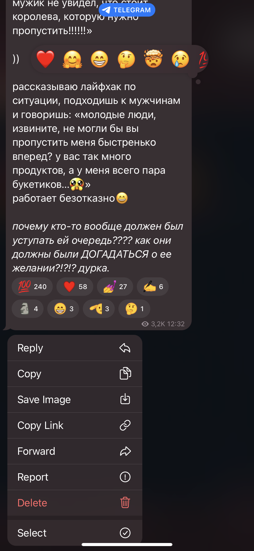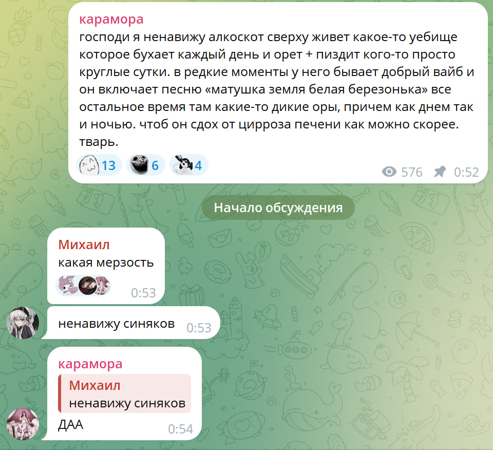 Вот Сораби вроде классная, но какая же пикмуха (мб поэтому и страдает из-за скуфов уродцев). Сейчас бы эту хуйню на скрине назвать мужененавистничеством… вот бы хуи также тянок ненавидели, плачась в комментариях, при этом даже не оскорбляя.